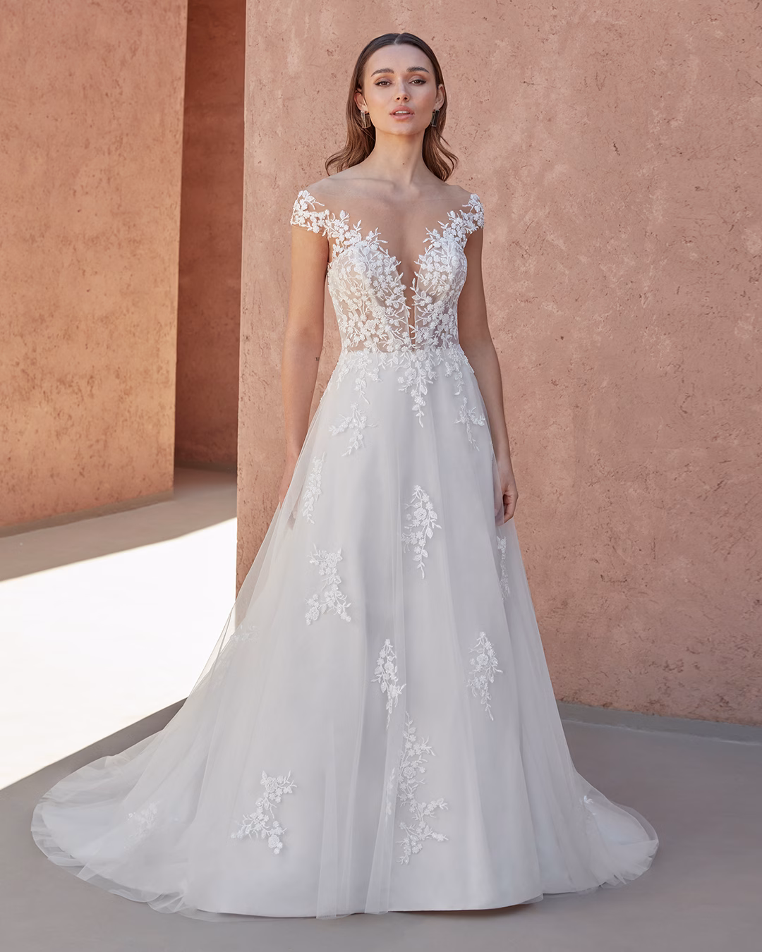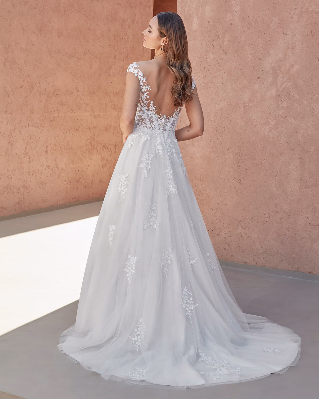 Vestido en línea A de tul con un pronunciado escote Sabrina de ilusión y mangas cortas. El corpiño está forrado en tul y organza desde el escote corazón hasta la espalda. Está adornado con apliques de encaje bordados con cuentas tonales que parecen flotar a lo largo de la falda. El diseño se completa con botones cubiertos de tul en la parte trasera y una cola en largo barrido.