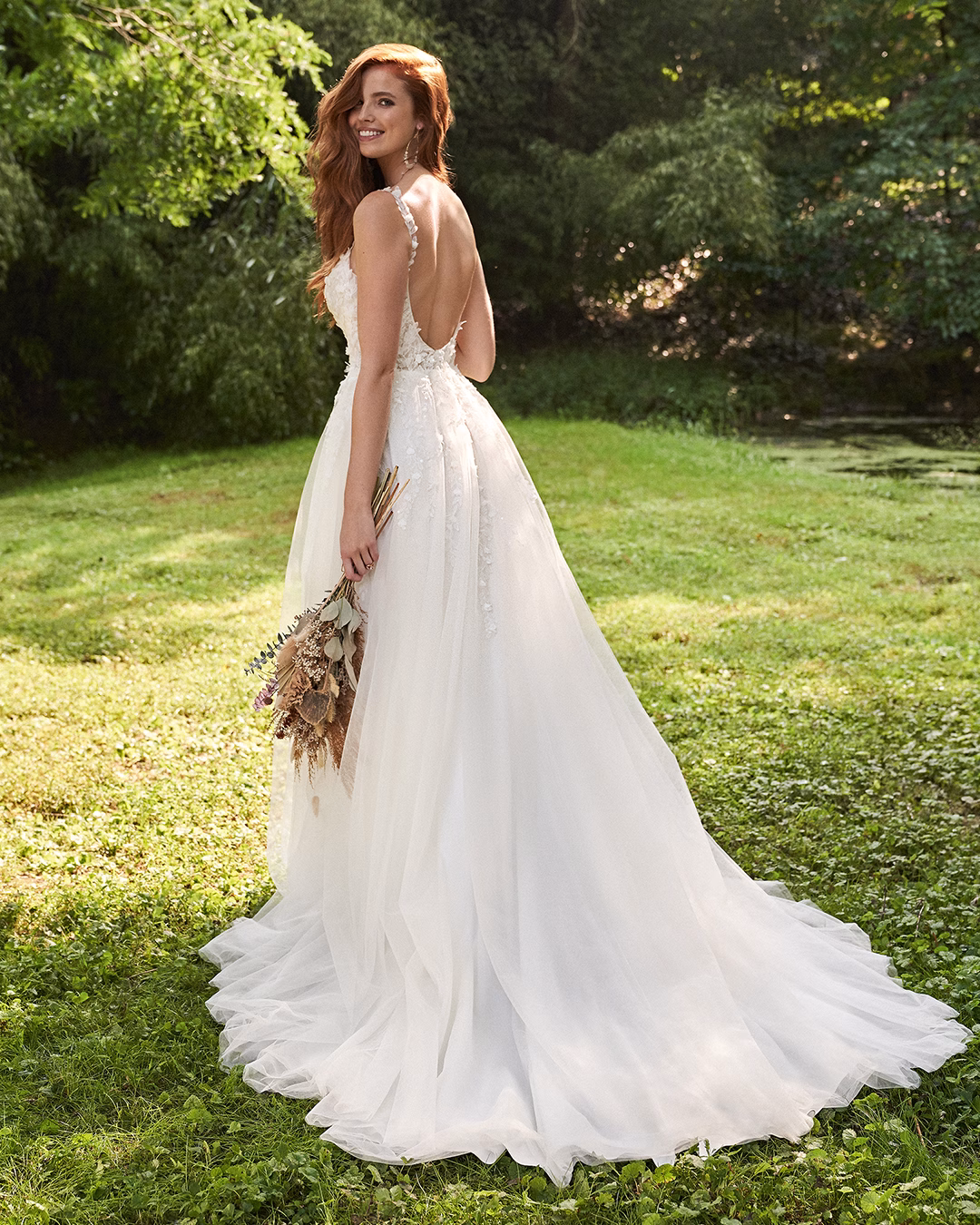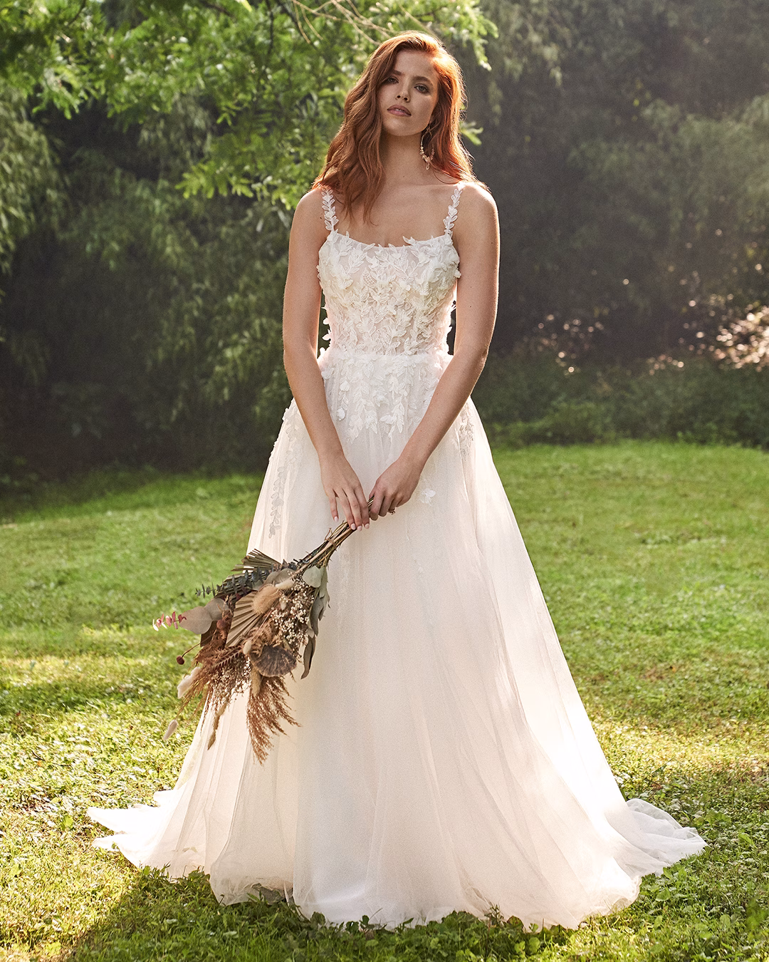 Vestido en línea A de tul con corpiño transparente que presenta un escote redondeado y finos tirantes de encaje que conducen a una espalda baja redondeada. Adornado con apliques de hojas bordadas con lentejuelas y cuentas tonales, junto con pétalos de gasa en 3D superpuestos. El corpiño está detallado con un forro de encaje Chantilly. Se completa con botones cubiertos de tul en la parte trasera del corpiño y una cola en largo capilla.