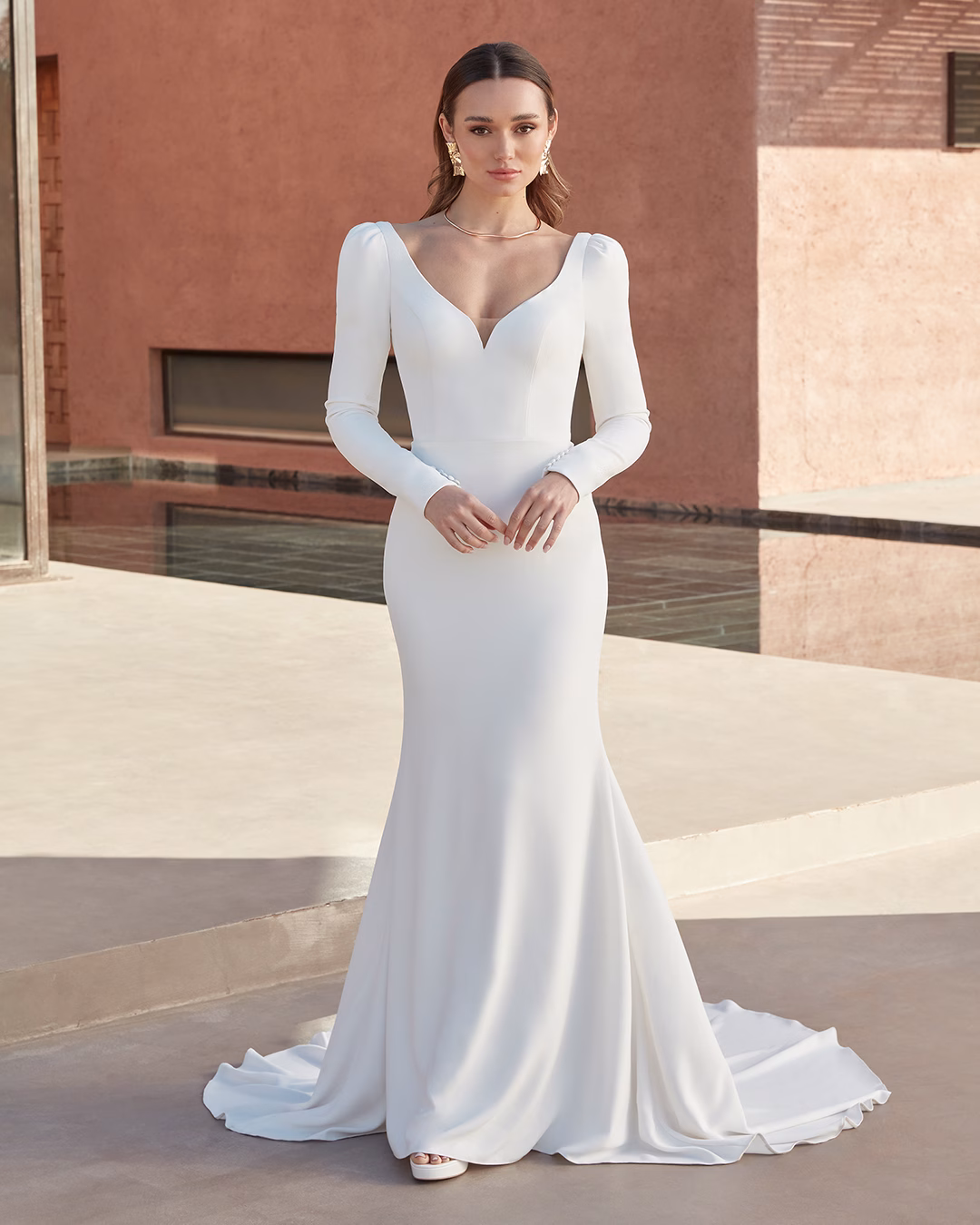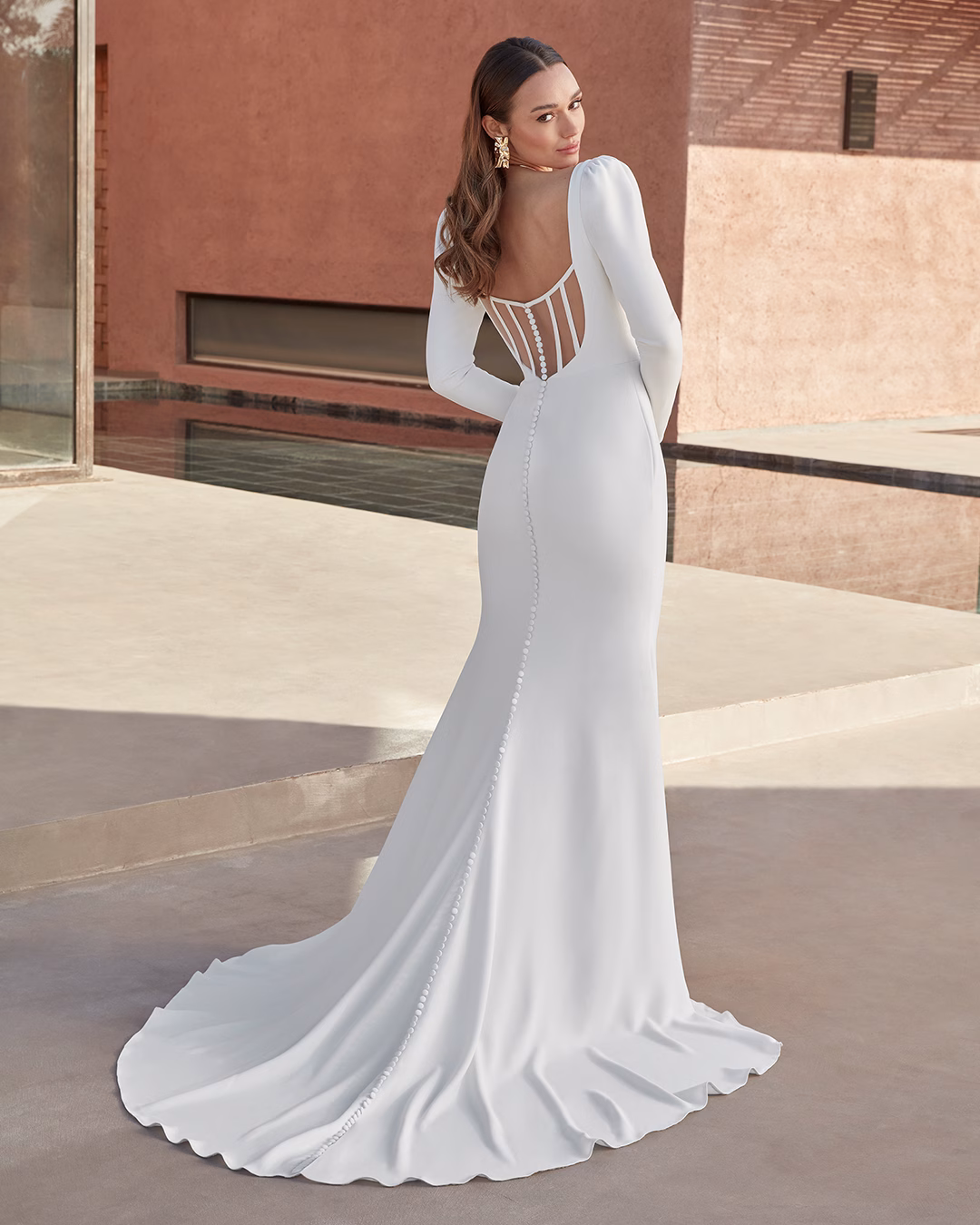 Vestido ajustado y trompeta en crepé con un escote en V modestamente pronunciado, mangas largas abullonadas y una espalda de ilusión abierta con varillas expuestas. El diseño se completa con un forro de jersey y botones cubiertos de crepé que se extienden hasta el final de la cola en largo capilla.