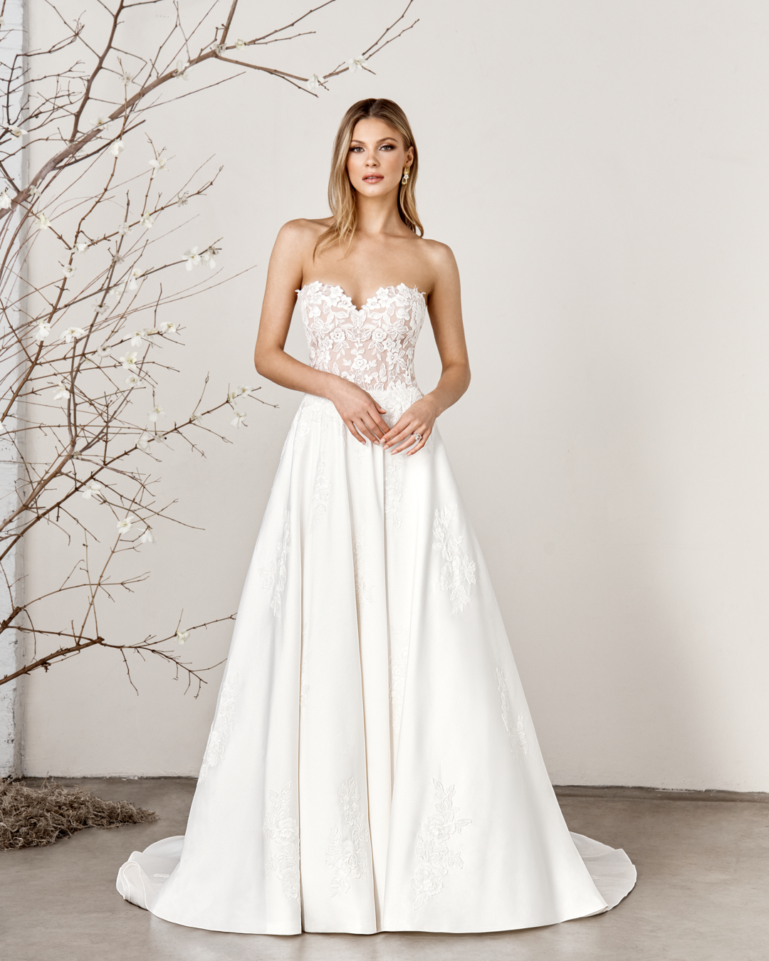 Este vestido fit and flare de jacquard se destaca por su escote tipo corazón sin tirantes, que resalta la figura de la novia con un diseño moderno y costuras elegantes en la parte del busto. La falda se ajusta delicadamente en las caderas y se abre en una hermosa forma de campana, proporcionando un equilibrio perfecto entre sofisticación y estilo contemporáneo. Incluye un cinturón desmontable que complementa el look y permite personalizar la silueta. En la parte posterior, un godet central añade un toque dramático y elegante a la cola de longitud capilla. Los botones cubiertos de jacquard que se extienden por toda la parte posterior del vestido completan el diseño, ofreciendo un acabado impecable y de alta costura.