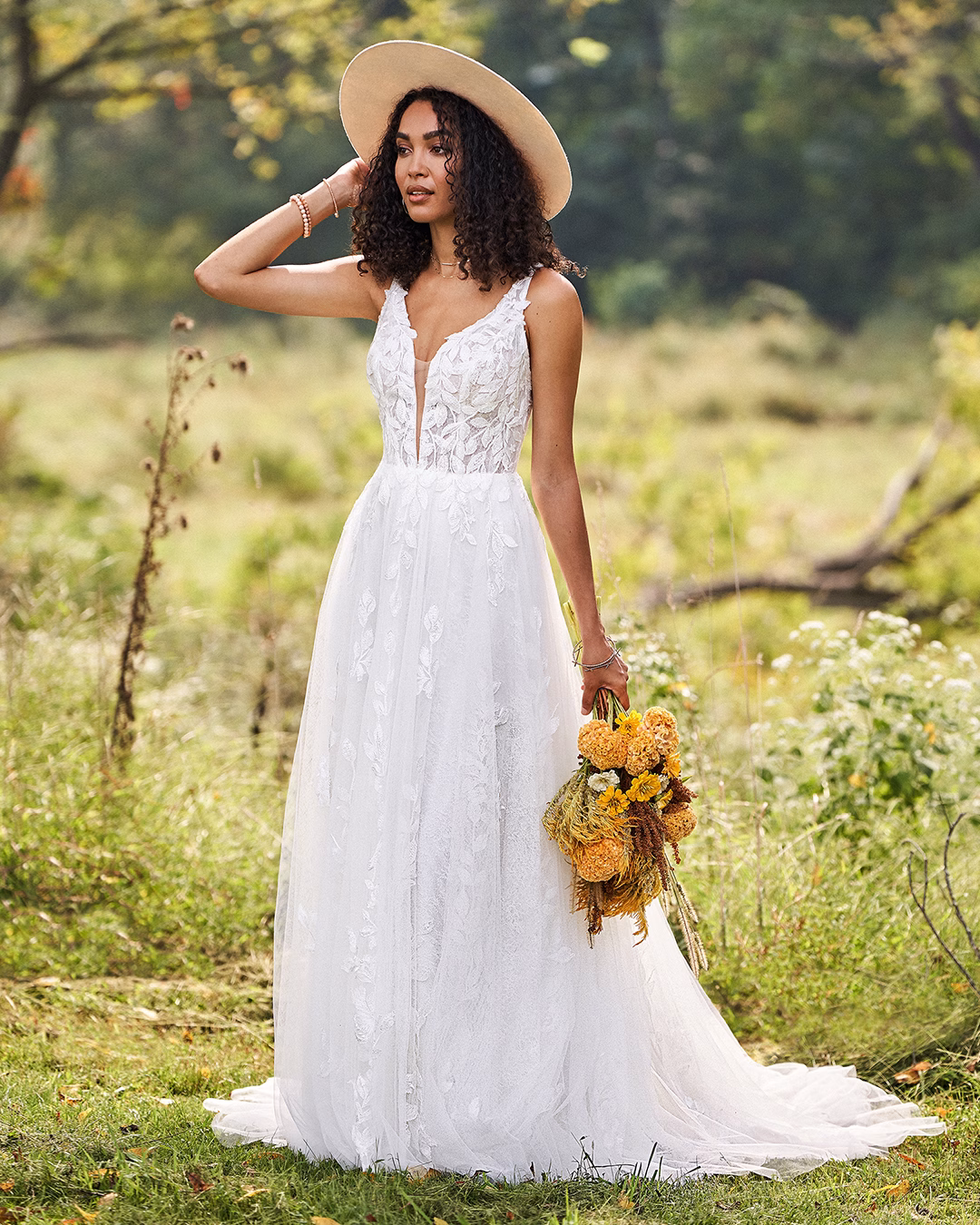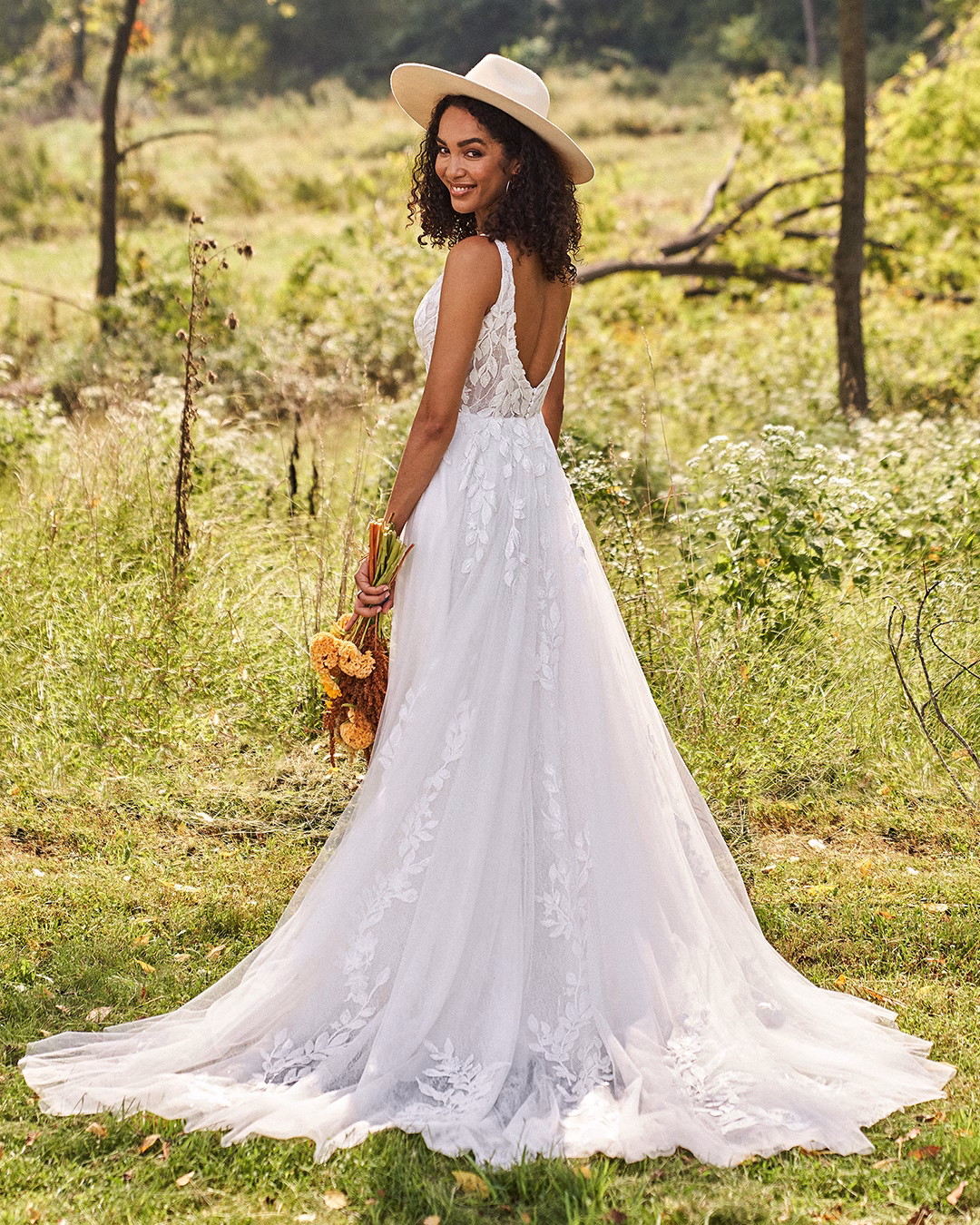 Vestido en línea A de tul con un corpiño transparente que presenta un escote en V pronunciado y una espalda en V. Adornado con apliques de encaje en forma de hojas con lentejuelas, sobre un forro de encaje Chantilly con lentejuelas. Se completa con botones cubiertos de tul en la parte trasera del corpiño y una cola en largo capilla.