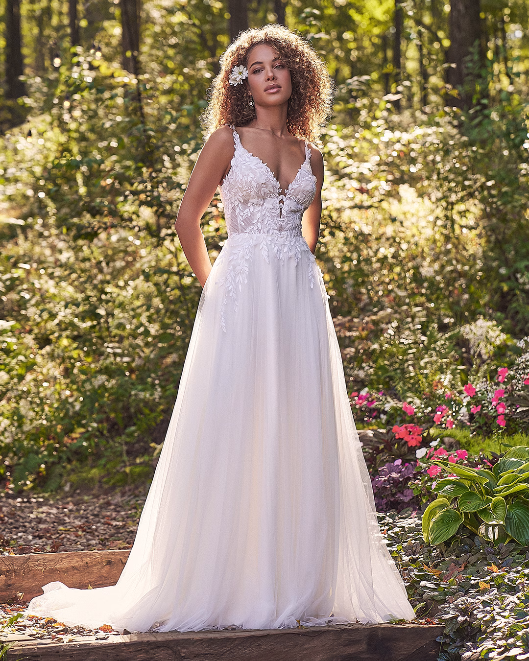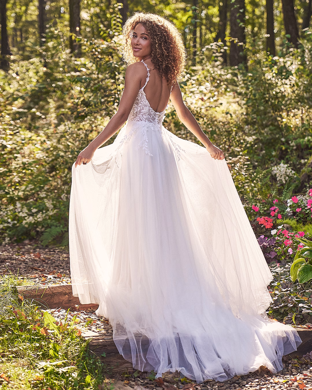 Vestido en línea A de tul inglés con corpiño plisado que presenta un escote bikini profundo y una espalda redondeada. Apliques de encaje ligeramente brillantes se combinan con flores en 3D que adornan el corpiño y descienden por la cintura. Se completa con forro de jersey, cola en largo barrido y botones cubiertos de tul inglés en la parte trasera del corpiño.