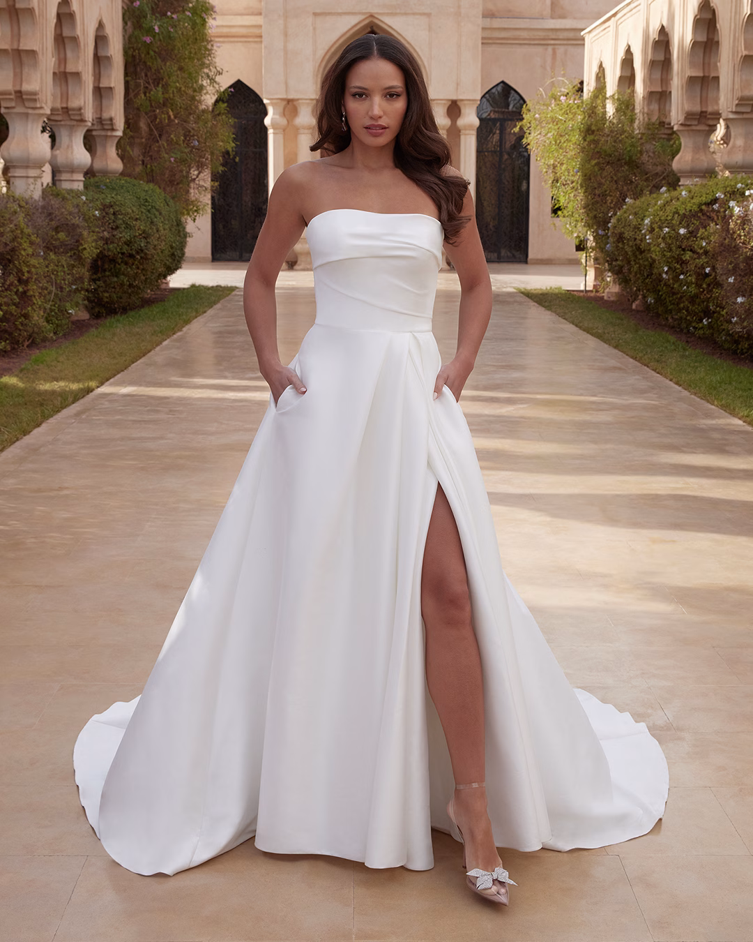 Vestido en línea A sin tirantes de Mikado elástico con escote recto drapeado. La falda plisada se extiende hacia un elegante corte en la pierna. Se completa con botones cubiertos de Mikado en la parte posterior y una cola en largo capilla que añade un toque de sofisticación.