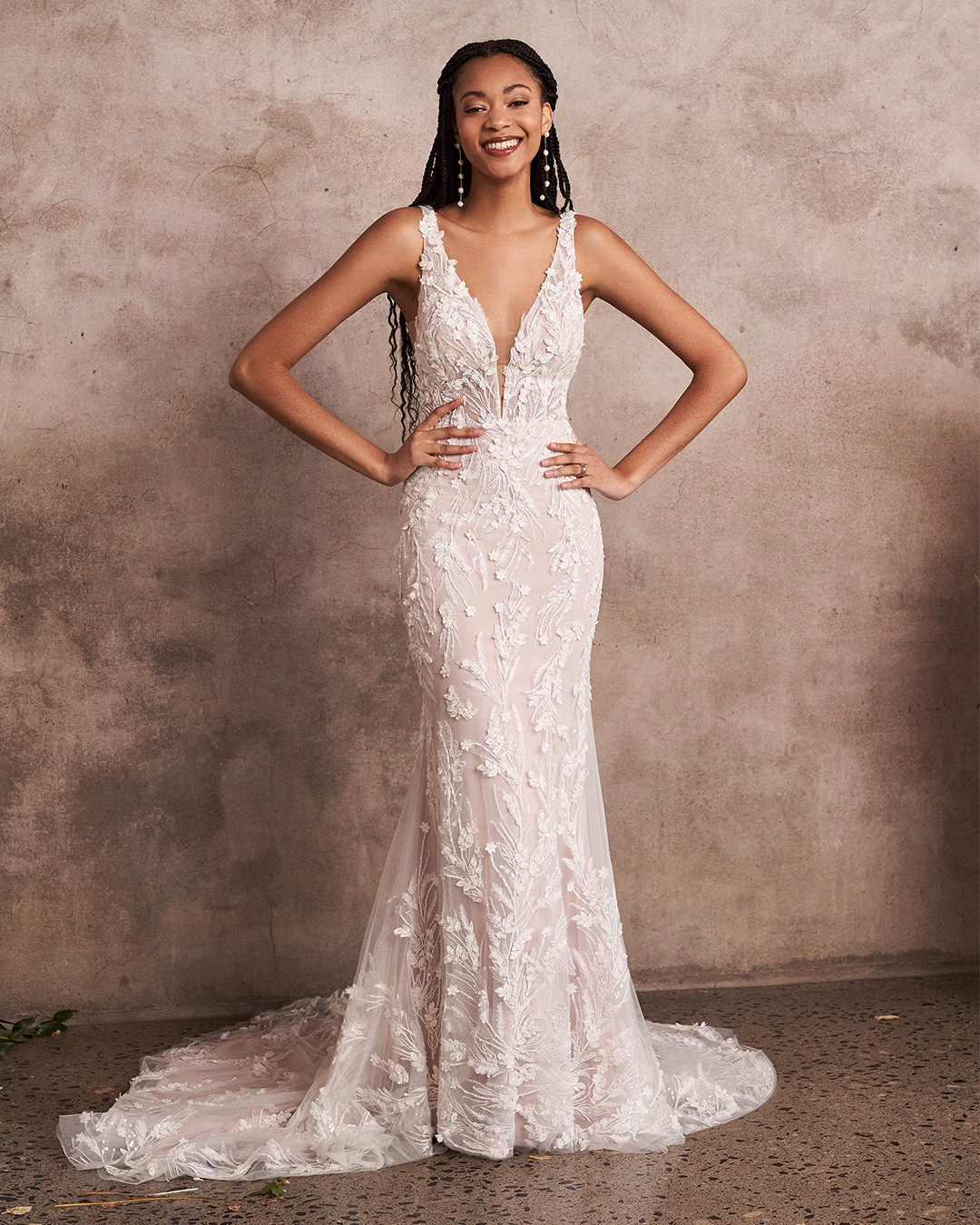 Vestido ajustado y trompeta con escote profundo en V, corsé de ilusión, inserciones laterales de ilusión y espalda baja en V. Presenta aplicaciones con lentejuelas y cuentas, junto con apliques de chiffon cortados con láser en 3D. Terminado con malla elástica, forro de jersey, cola de longitud capilla y botones cubiertos de tul en la parte posterior. Incluye lazos de tul desmontables en los hombros, que vienen con el vestido.