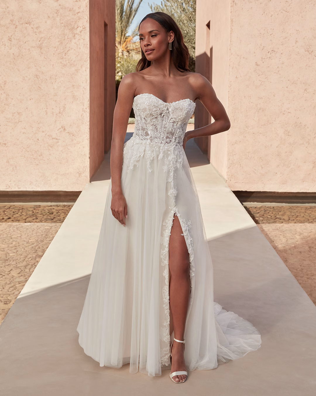 Vestido en línea A de tul sin tirantes con corpiño transparente que presenta un escote corazón, copas tipo «demi» y varillas sutilmente expuestas. El corpiño cuenta con un forro de encaje Chantilly. Apliques de encaje bordados con cuentas y lentejuelas adornan el corpiño y descienden por la falda, mientras que los apliques de encaje Chantilly caen delicadamente en la segunda capa de la falda. El diseño se completa con una abertura, botones cubiertos de encaje Chantilly en la parte trasera del corpiño y una cola en largo capilla.