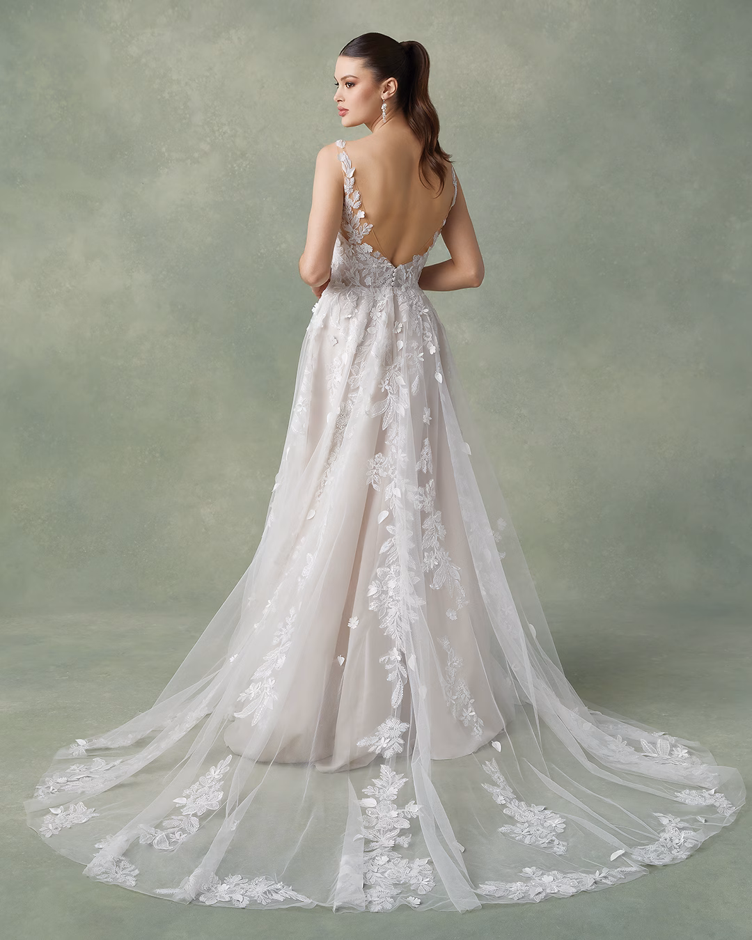 Vestido en línea A adornado con apliques de encaje bordados con cuentas y pétalos en 3D.