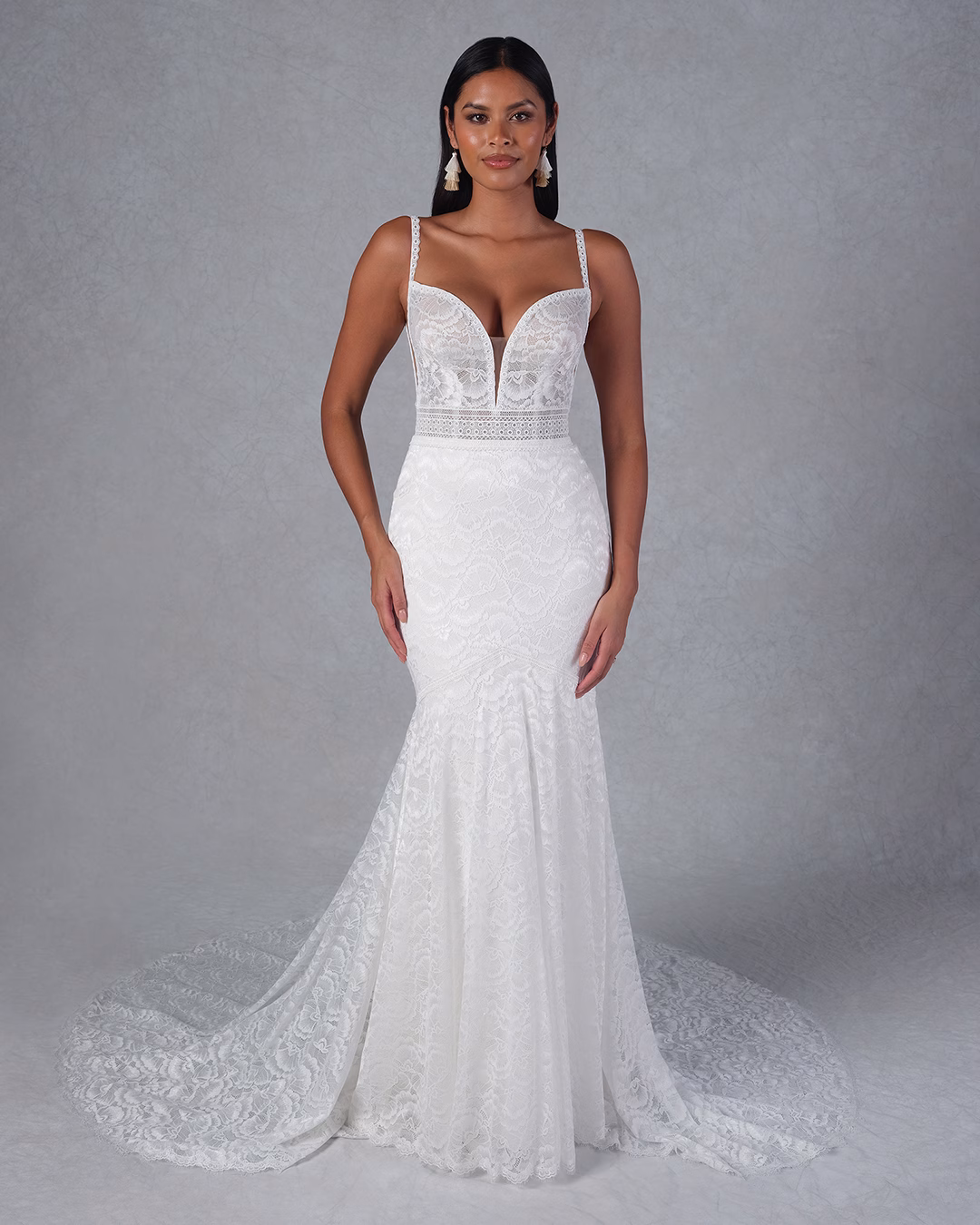 Vestido ajustado y trompeta de encaje elástico con escote bikini pronunciado, cortes en forma de V a los lados y finos tirantes de encaje que conducen a una espalda en V. El encaje decorativo crea un detalle tipo fajín en la línea de la cintura, mientras que el dobladillo se completa con un acabado de encaje de pestañas en forma de ola. Se finaliza con forro de jersey, botones cubiertos de tul en la parte trasera y una cola en largo barrido.
