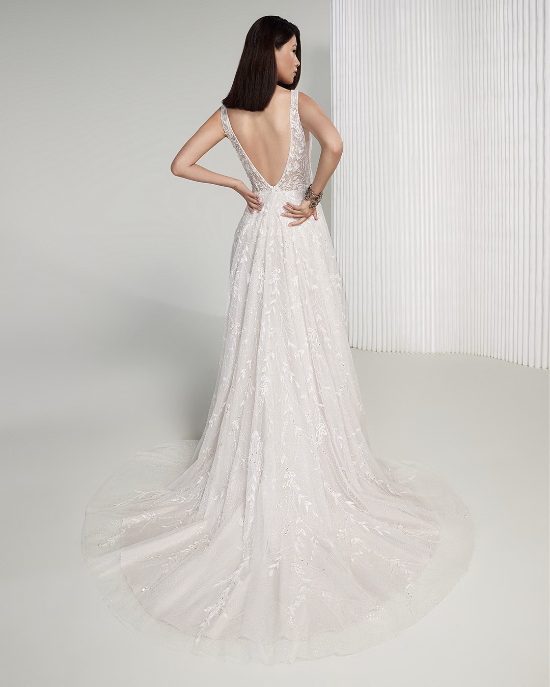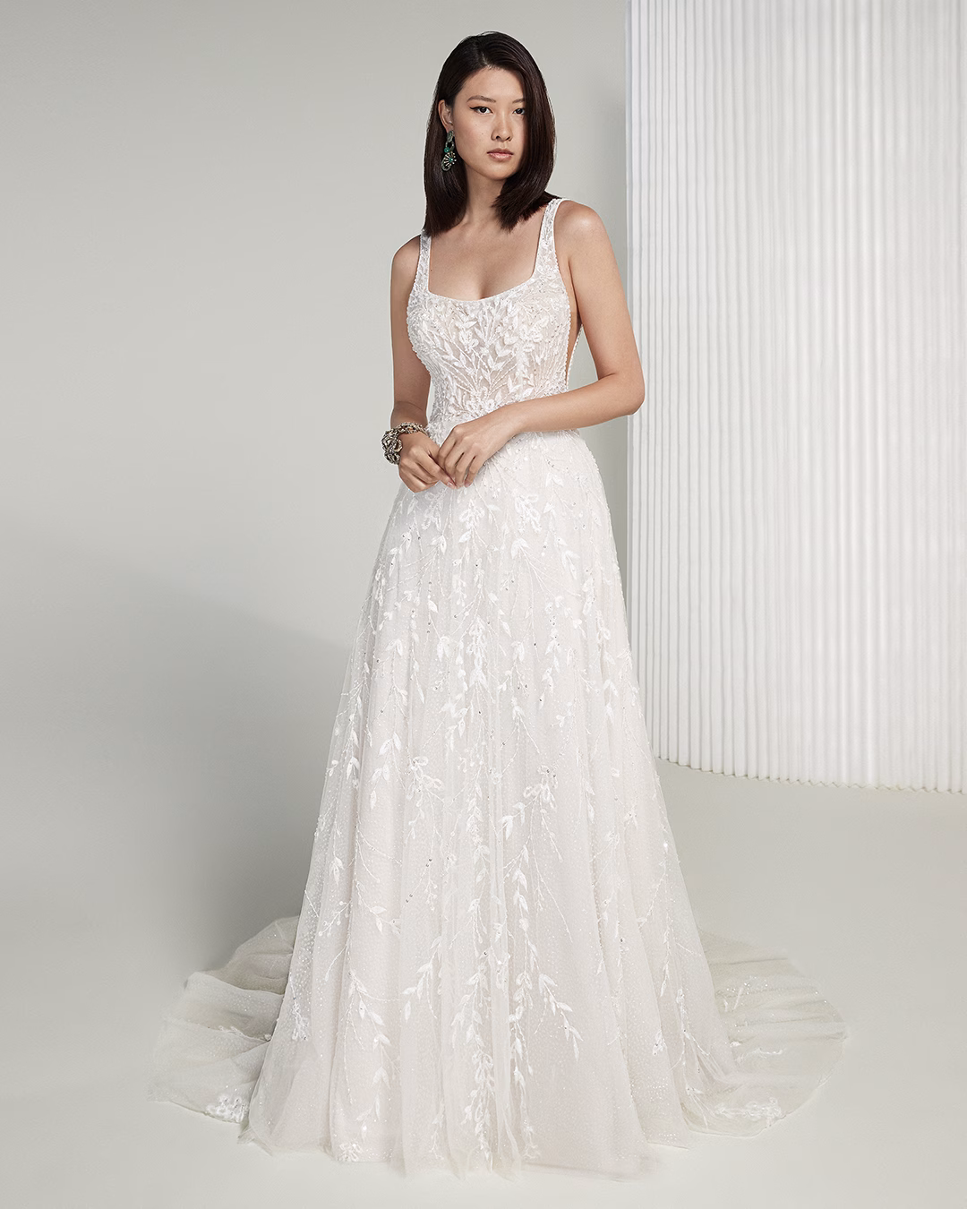 Vestido de novia en línea A con escote cuadrado y bordado de cuentas en todo el diseño.