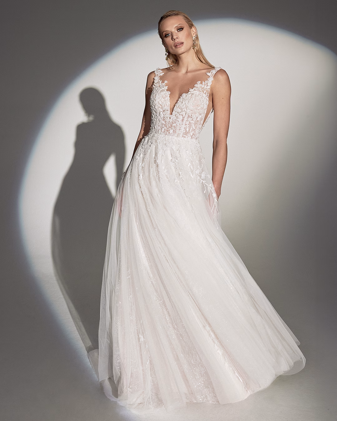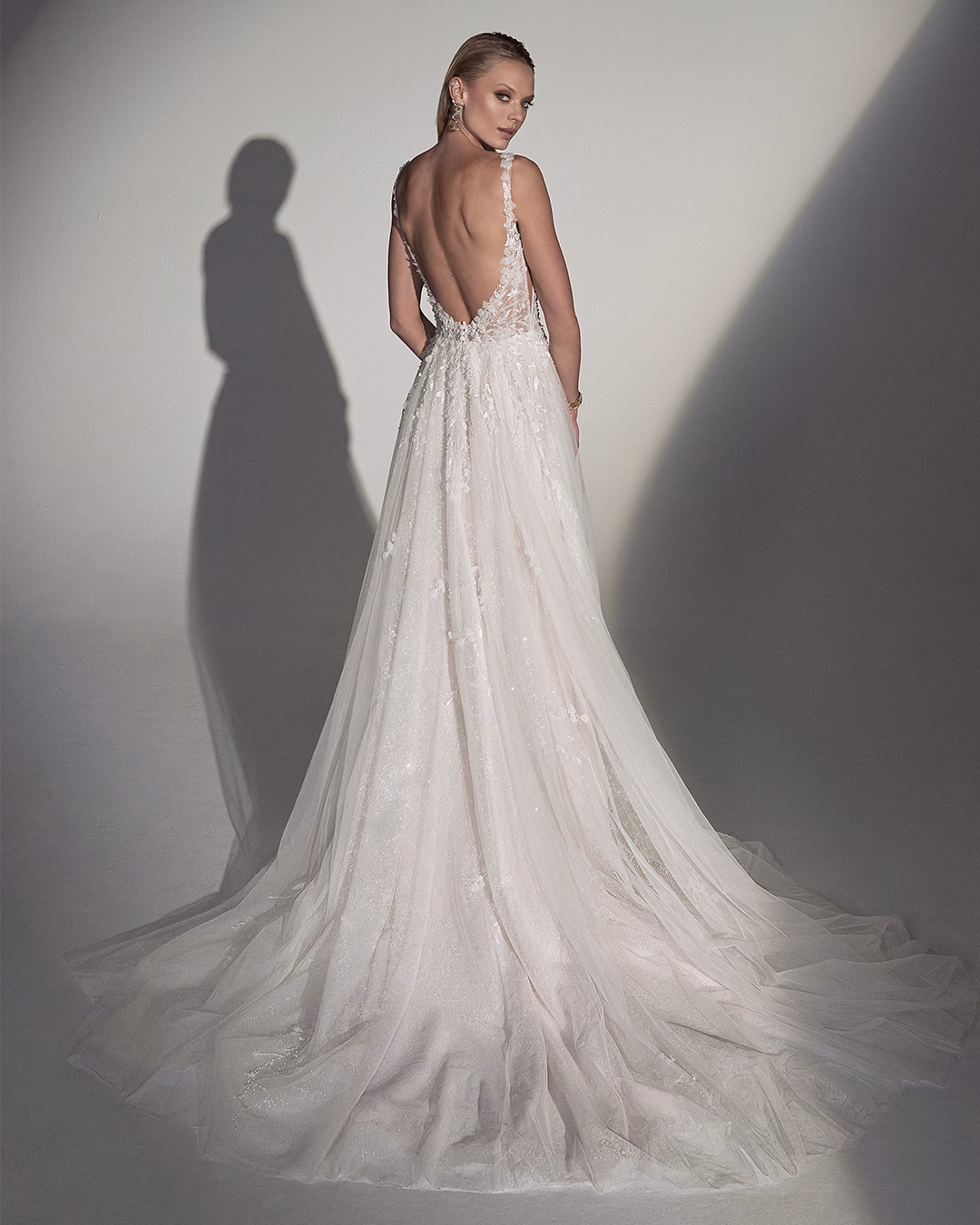 Vestido en línea A de tul con escote illusion Sabrina pronunciado, corpiño transparente, recortes en V a los lados y espalda baja en V. Presenta bordado de cuentas tonales con pétalos de gasa cortados con láser en 3D y está adornado con un forro de tul brillante. El diseño se completa con una cola en largo capilla y botones cubiertos de tul en la parte trasera del corpiño.