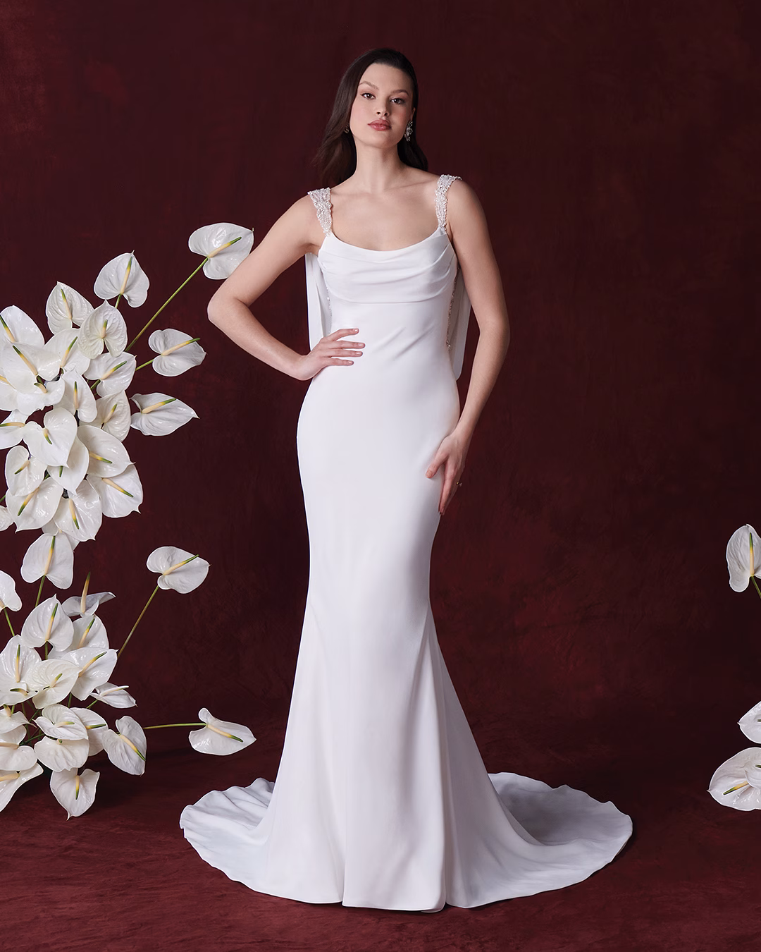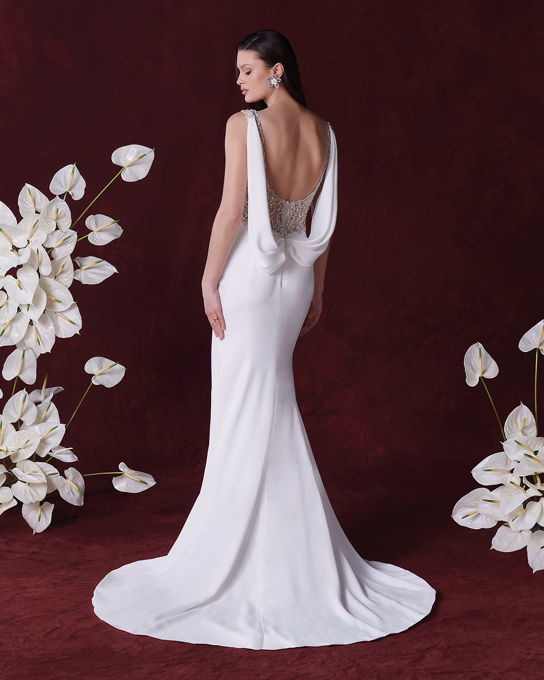 Vestido ajustado y trompeta de crepé con escote redondeado drapeado, cintura imperio y tirantes bordados con cuentas que conducen a una espalda redondeada de ilusión adornada con bordado a mano con cuentas. Se presenta con un cowl de crepé desmontable que se adjunta en la parte trasera. El diseño se completa con una cremallera invisible y una cola en largo barrido.