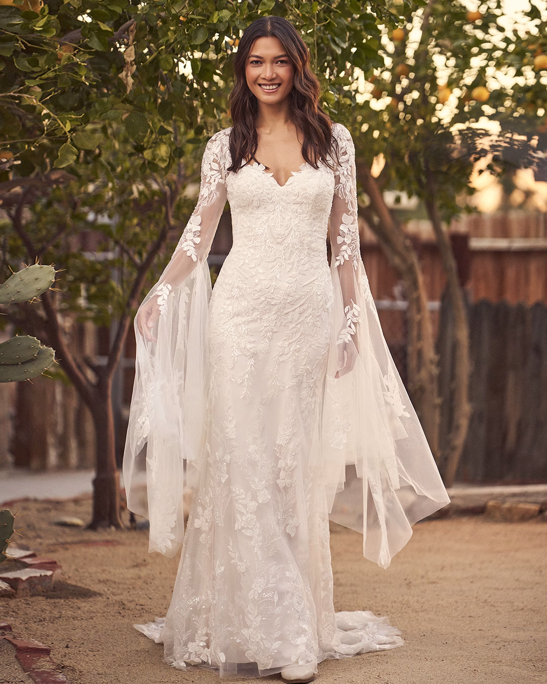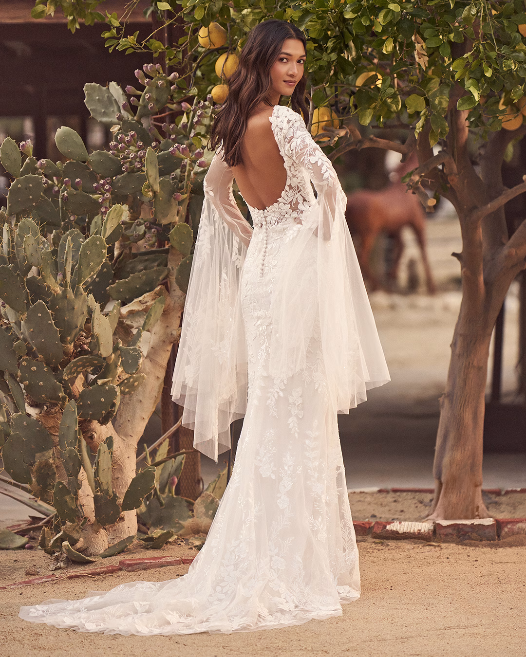 Vestido ajustado y trompeta con escote corazón, espalda baja en V, y corpiño frontal forrado hasta las costuras laterales. El vestido está adornado con apliques de encaje bordados con cuentas y lentejuelas. Se completa con forro de jersey, cola en largo capilla, y botones cubiertos de jersey en la parte trasera del corpiño.