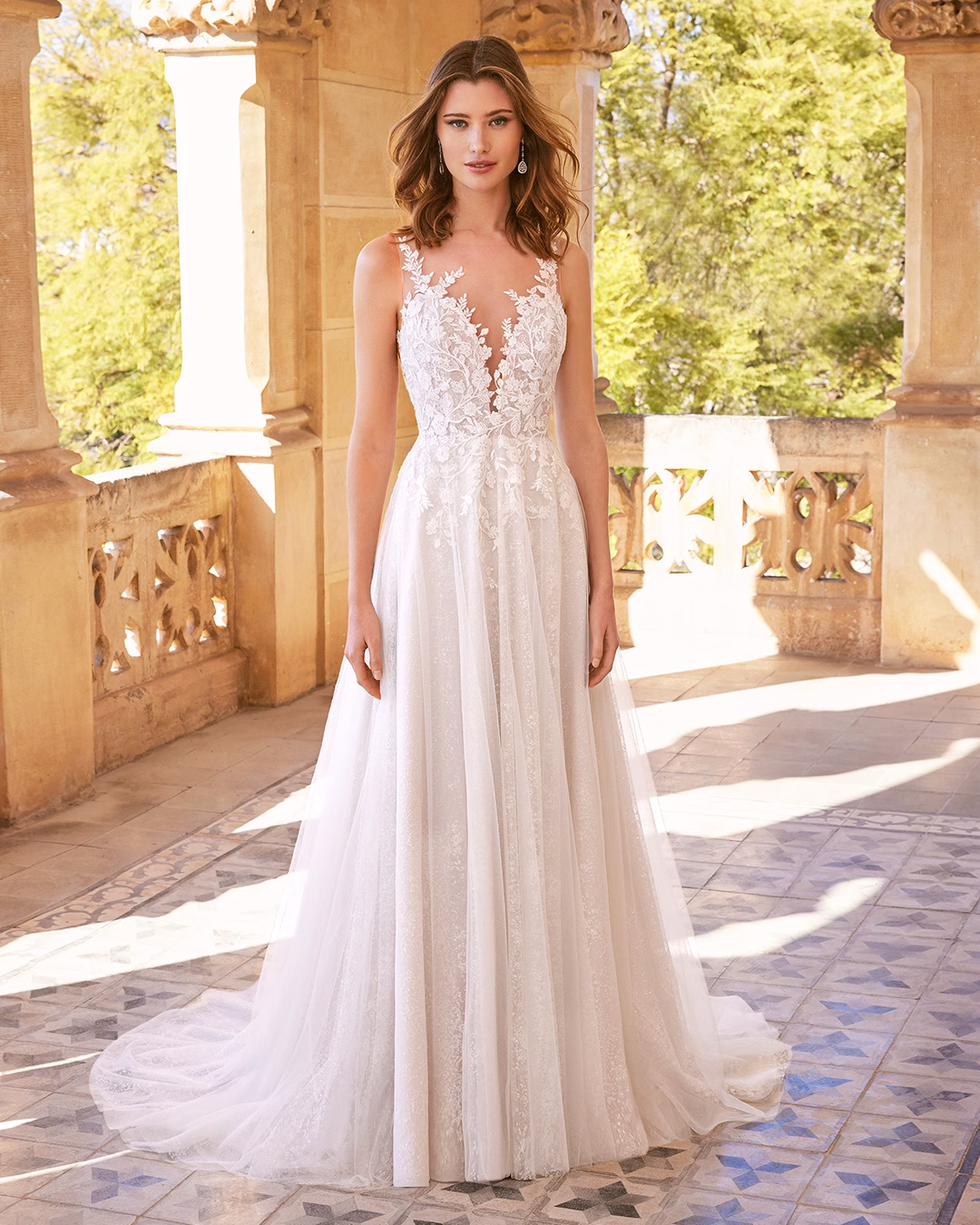 Vestido en línea A con escote ilusión Sabrina en forma de V y espalda baja con detalle en forma de ojal. Este diseño presenta una base de tul brillante que añade un toque de glamour, mientras que los apliques de encaje con lentejuelas caen en cascada entre las dos capas de la falda, creando un efecto deslumbrante. El vestido se completa con botones cubiertos de tul en la parte posterior del corpiño y una cola de largo barrido, ideal para una novia que desea un look etéreo y sofisticado.
