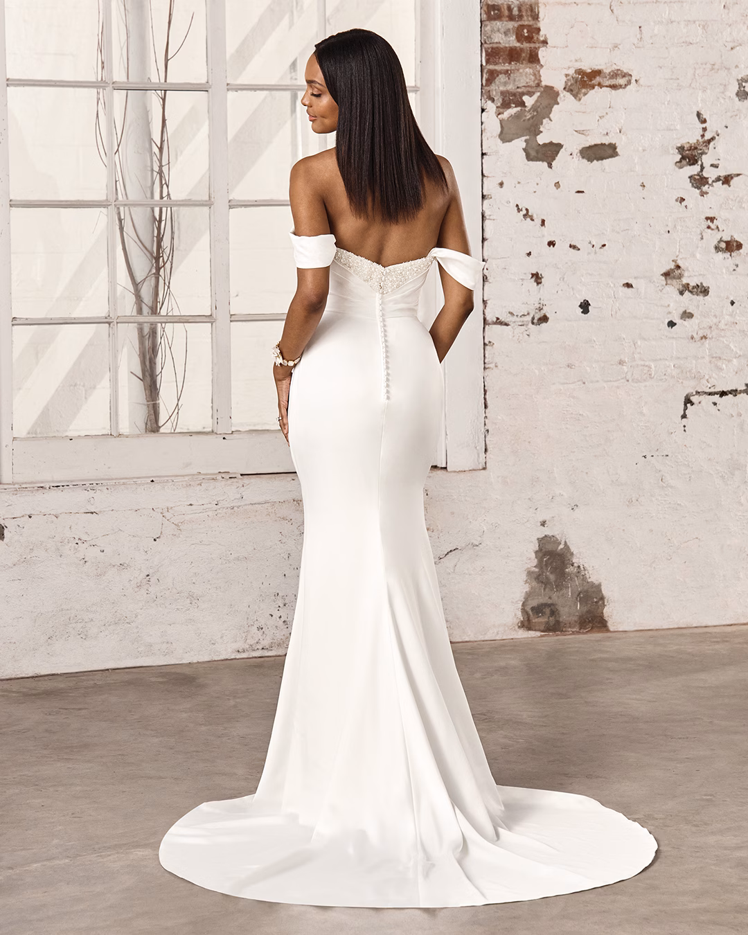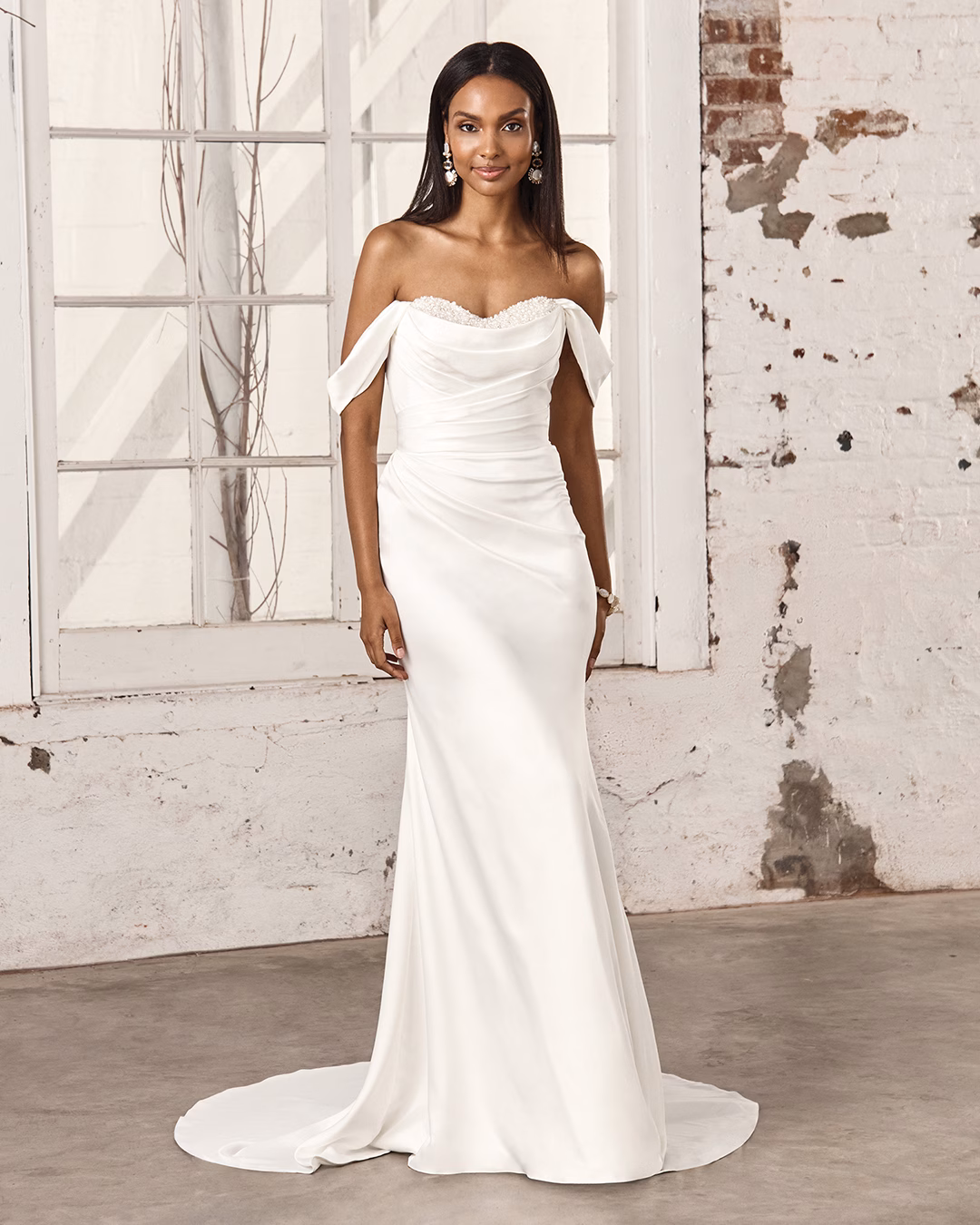 Vestido ajustado y trompeta de charmeuse con un elegante escote corazón, acompañado de tirantes desmontables que caen fuera de los hombros para un toque versátil. El escote está adornado con una mezcla lujosa de perlas, cuentas y brillantes incrustaciones de pedrería que aportan un toque de sofisticación. El corpiño presenta detalles plisados que continúan suavemente por toda la falda, resaltando la silueta de manera fluida. El diseño se completa con un forro de jersey que garantiza comodidad, una cola en largo barrido y botones forrados de charmeuse en la parte posterior del corpiño. Los tirantes desmontables están incluidos con el vestido, ofreciendo múltiples opciones de estilo.