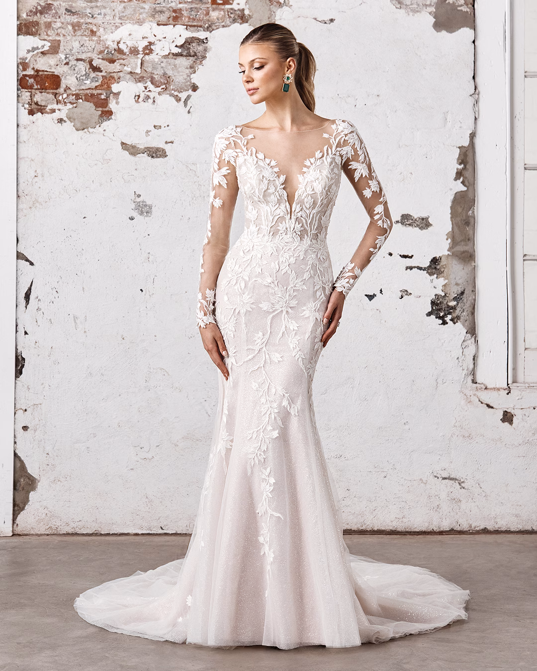 Este vestido fit and flare resalta por su escote halter profundo que acentúa el cuello y la figura. El cuerpo del vestido es transparente, con un diseño que incluye un elegante corte de cintura basque invertido, que define la silueta de manera sofisticada. Está adornado con apliques de encaje brillantes que añaden un toque de lujo y glamour. La terminación de la falda presenta un delicado encaje con borde en forma de concha, que complementa la estética del vestido. La parte posterior es abierta, mostrando una espalda elegante y moderna, y se completa con botones cubiertos de jersey que añaden un detalle refinado. La cola es de longitud capilla, lo que proporciona un efecto de dramatismo y elegancia al caminar.
