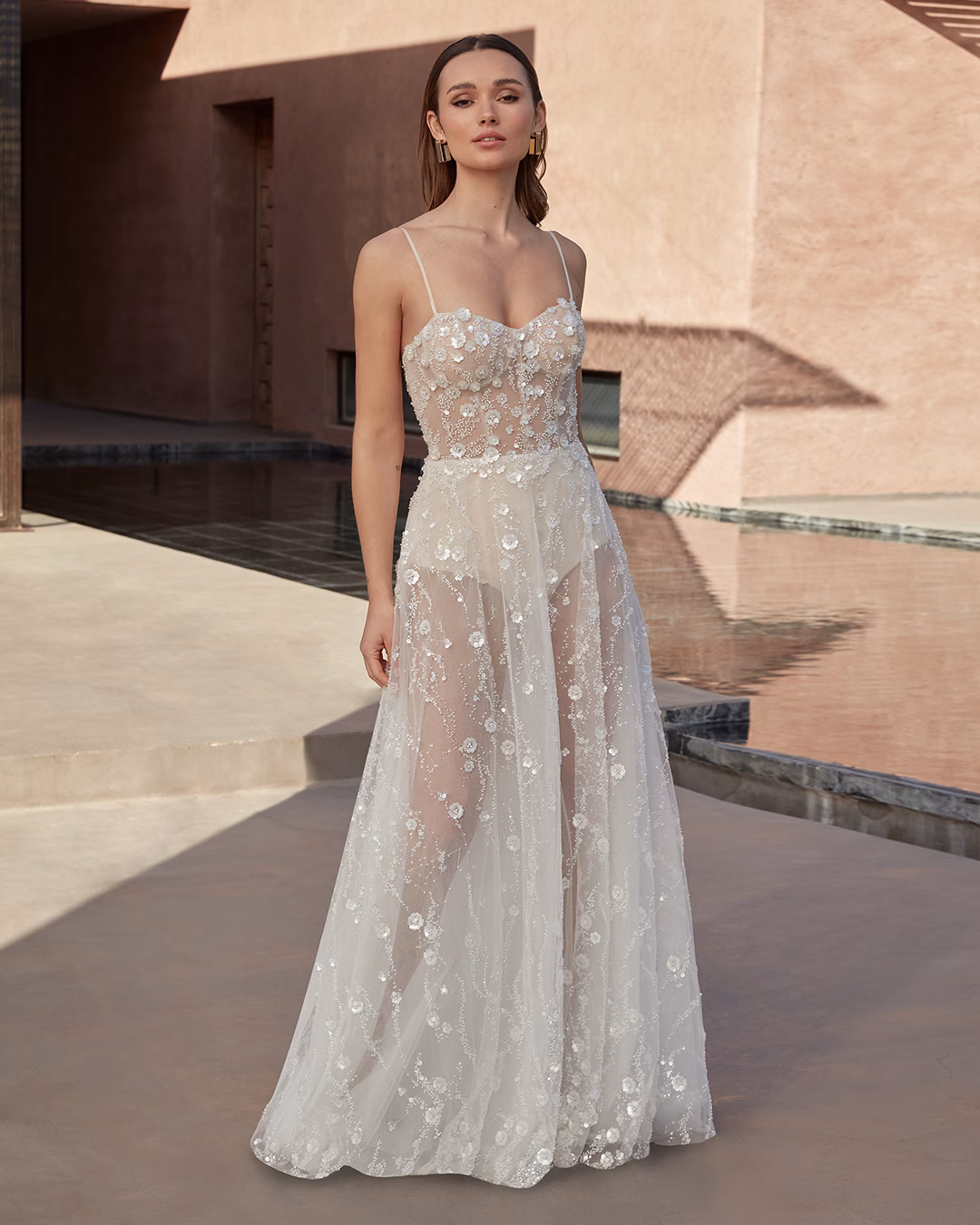 Vestido en línea A con corpiño transparente, escote corazón con costuras de copas tipo «demi» y tirantes finos. Presenta una falda transparente con un body debajo. Se incluye un forro de jersey desmontable con el vestido. Adornado con bordados de cuentas que incluyen lentejuelas, perlas y paillettes en todo el diseño. El vestido se completa con una cremallera invisible.