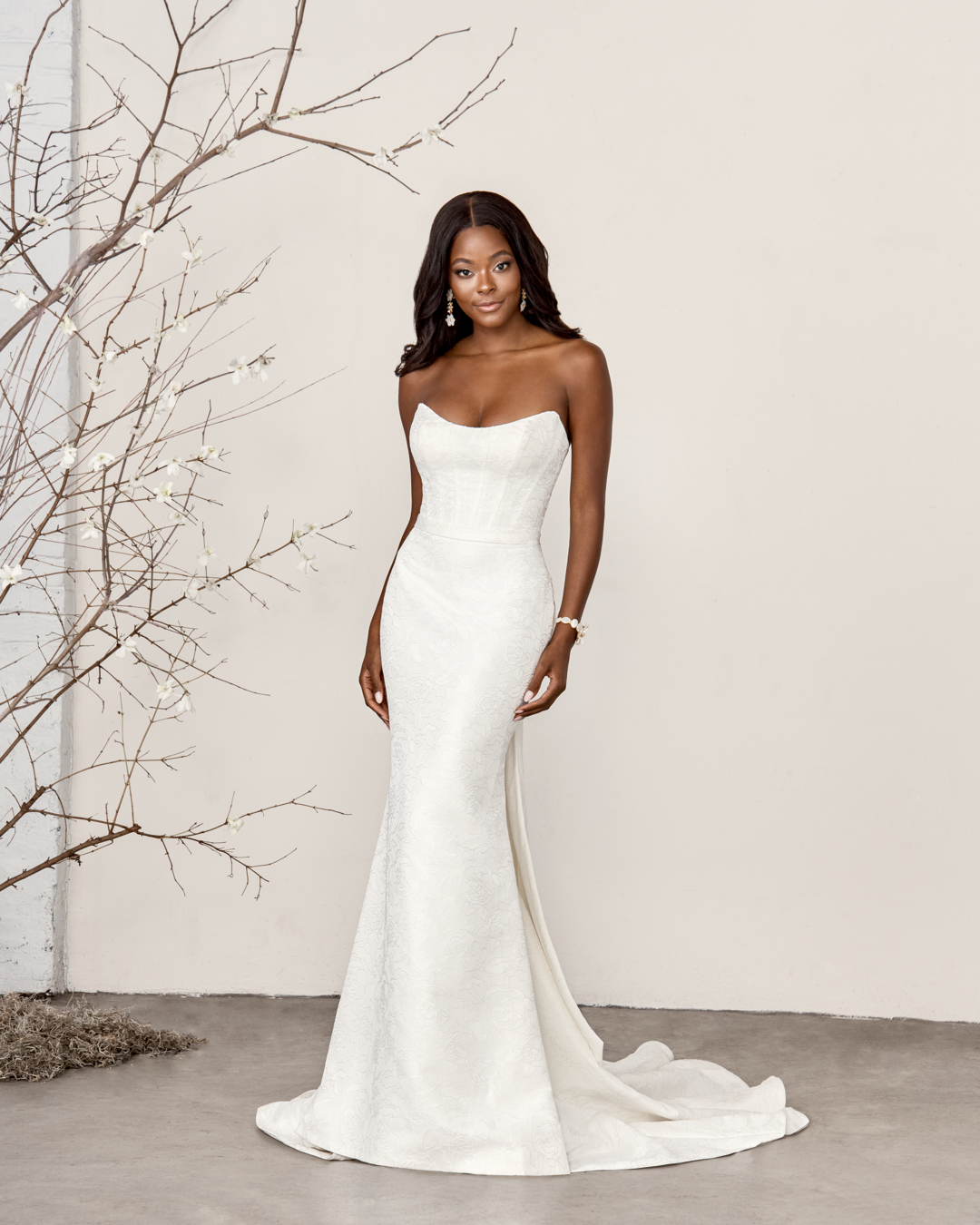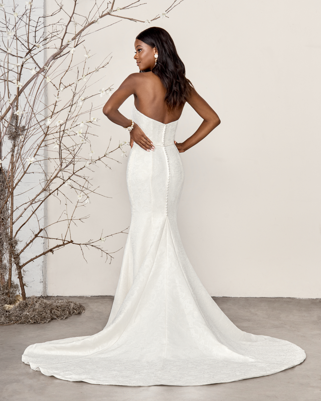 Este vestido fit and flare de jacquard se destaca por su escote tipo corazón sin tirantes, que resalta la figura de la novia con un diseño moderno y costuras elegantes en la parte del busto. La falda se ajusta delicadamente en las caderas y se abre en una hermosa forma de campana, proporcionando un equilibrio perfecto entre sofisticación y estilo contemporáneo. Incluye un cinturón desmontable que complementa el look y permite personalizar la silueta. En la parte posterior, un godet central añade un toque dramático y elegante a la cola de longitud capilla. Los botones cubiertos de jacquard que se extienden por toda la parte posterior del vestido completan el diseño, ofreciendo un acabado impecable y de alta costura.