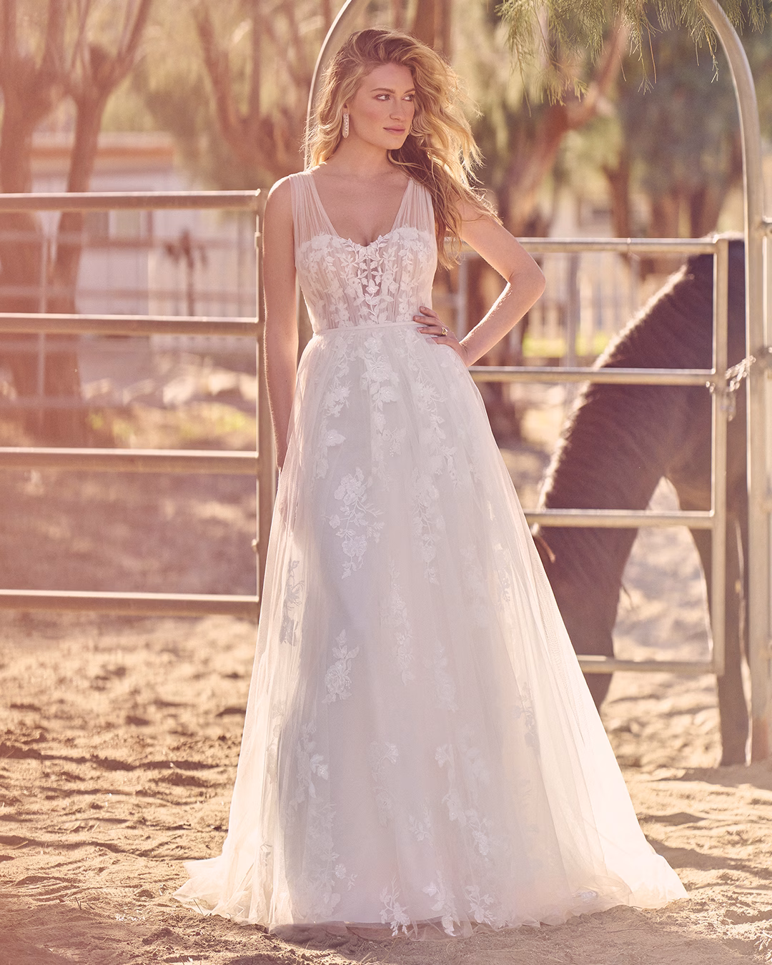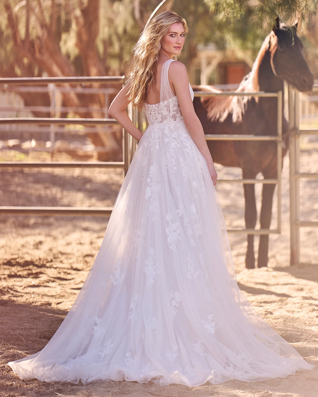 Vestido en línea A de tul con corpiño transparente y escote corazón, debajo de tirantes de tul plisado. Los apliques de encaje con lentejuelas se colocan debajo del plisado y flotan a lo largo de la segunda capa de la falda. Se presenta con un cinturón sesgado desmontable en la cintura natural, incluido con el vestido. Se completa con una cola en largo capilla y botones cubiertos de tul en la parte trasera del corpiño.