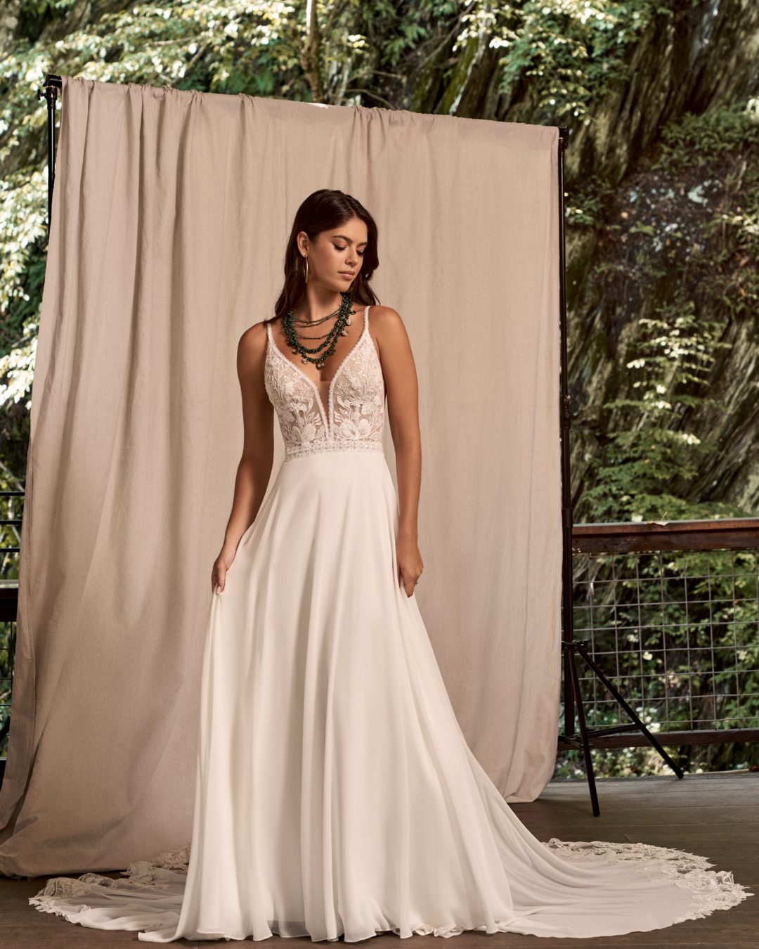 | Tendencia | Bordado tonal, Cola detallada, Encaje moderno, Escote en bikini profundo |