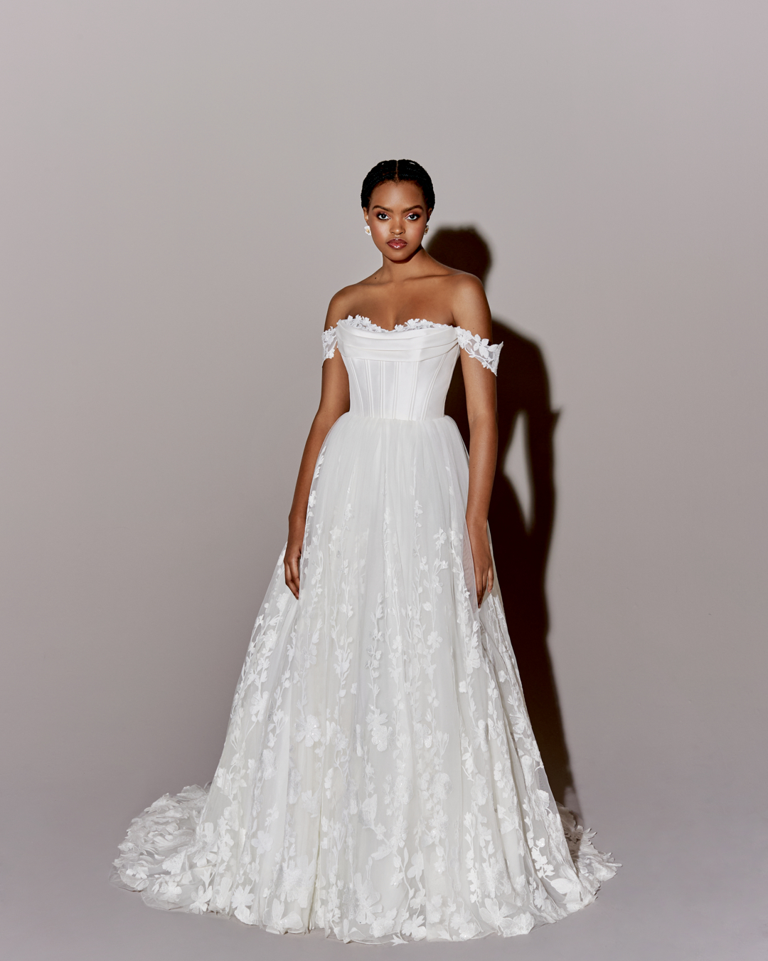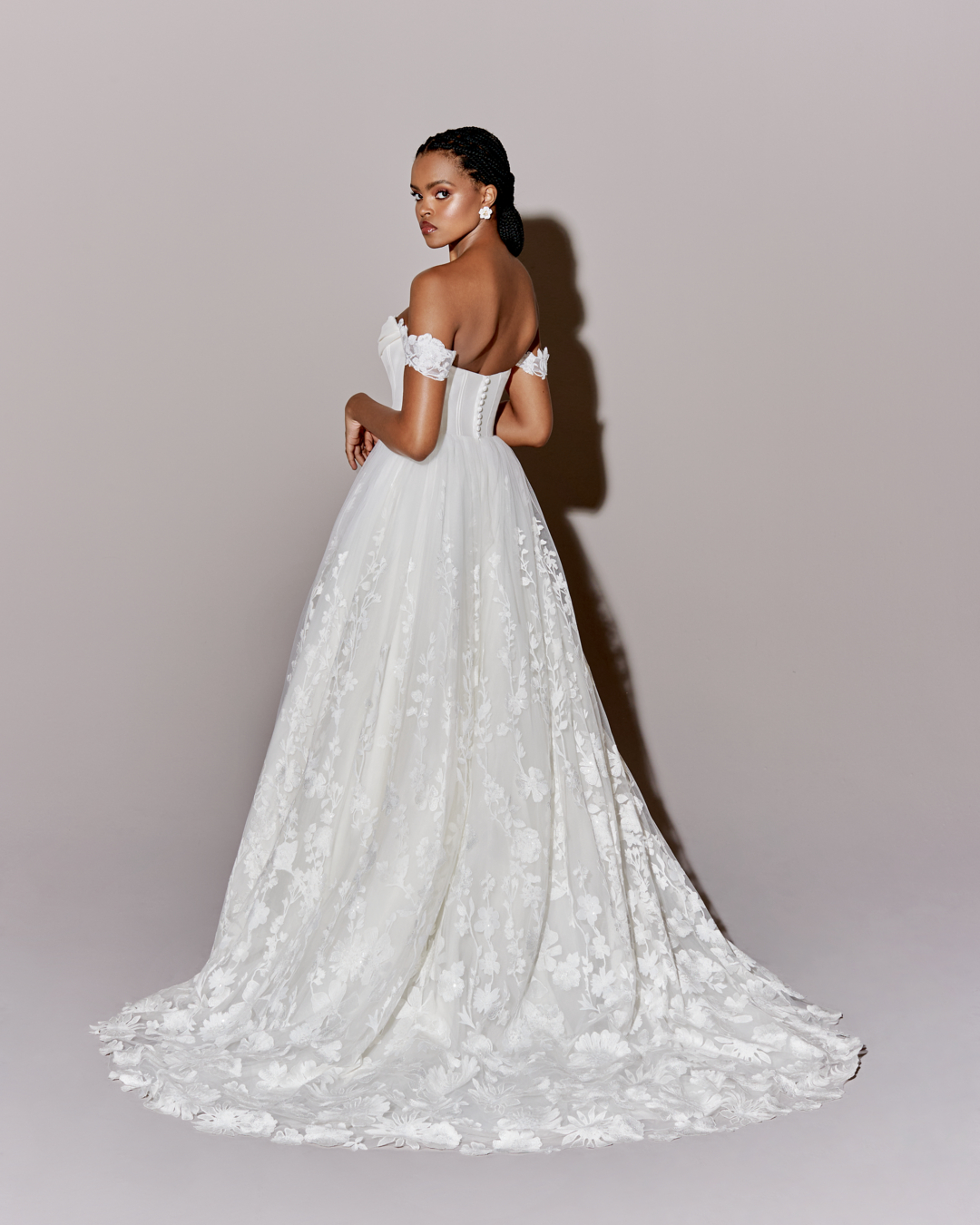 Vestido por debajo del hombro con tirantes desmontables que presenta un escote en forma de corazón con aplicaciones de encaje con lentejuelas debajo de un escote de Mikado plisado. Los detalles de huesos expuestos adornan el corsé y se extienden hacia una falda de tul completa con encaje bordado y lentejuelas. Terminado con cremallera invisible, una cola de longitud capilla y botones cubiertos de Mikado en la parte posterior del corsé. Se incluyen tirantes desmontables con el vestido.