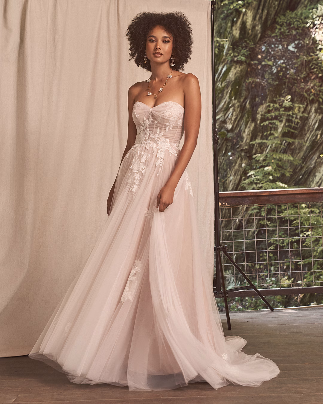 Vestido en línea A de tul con escote corazón. Los pliegues de tul acentúan el corpiño sobre apliques de encaje, varillas expuestas y copas demi. Apliques de encaje mate flotan a lo largo de las dos capas de la falda. Se completa con cremallera invisible, botones cubiertos de tul en la parte trasera del corpiño, forro de jersey y una cola en largo capilla.