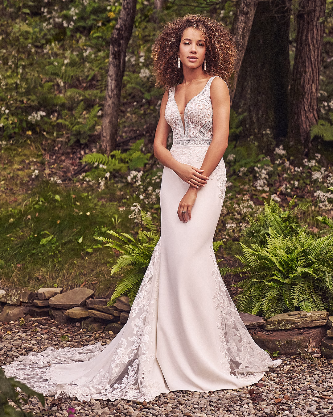 Vestido ajustado y trompeta de crepé elástico con corpiño transparente que presenta un escote en V profundo, cortes laterales en V y espalda en V. El corpiño está detallado con bordes de encaje mezclados con apliques de encaje mate. Los apliques se extienden por la falda, detallando los godets laterales y creando una cola en largo capilla con recortes en forma de concha. Se completa con forro de jersey y botones cubiertos de crepé que se extienden por la parte trasera hasta el inicio de la cola.