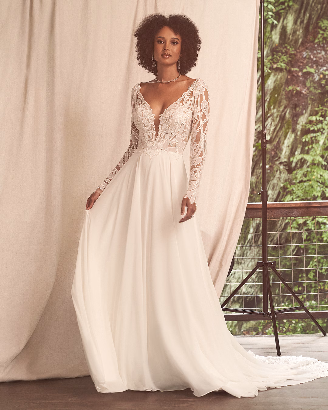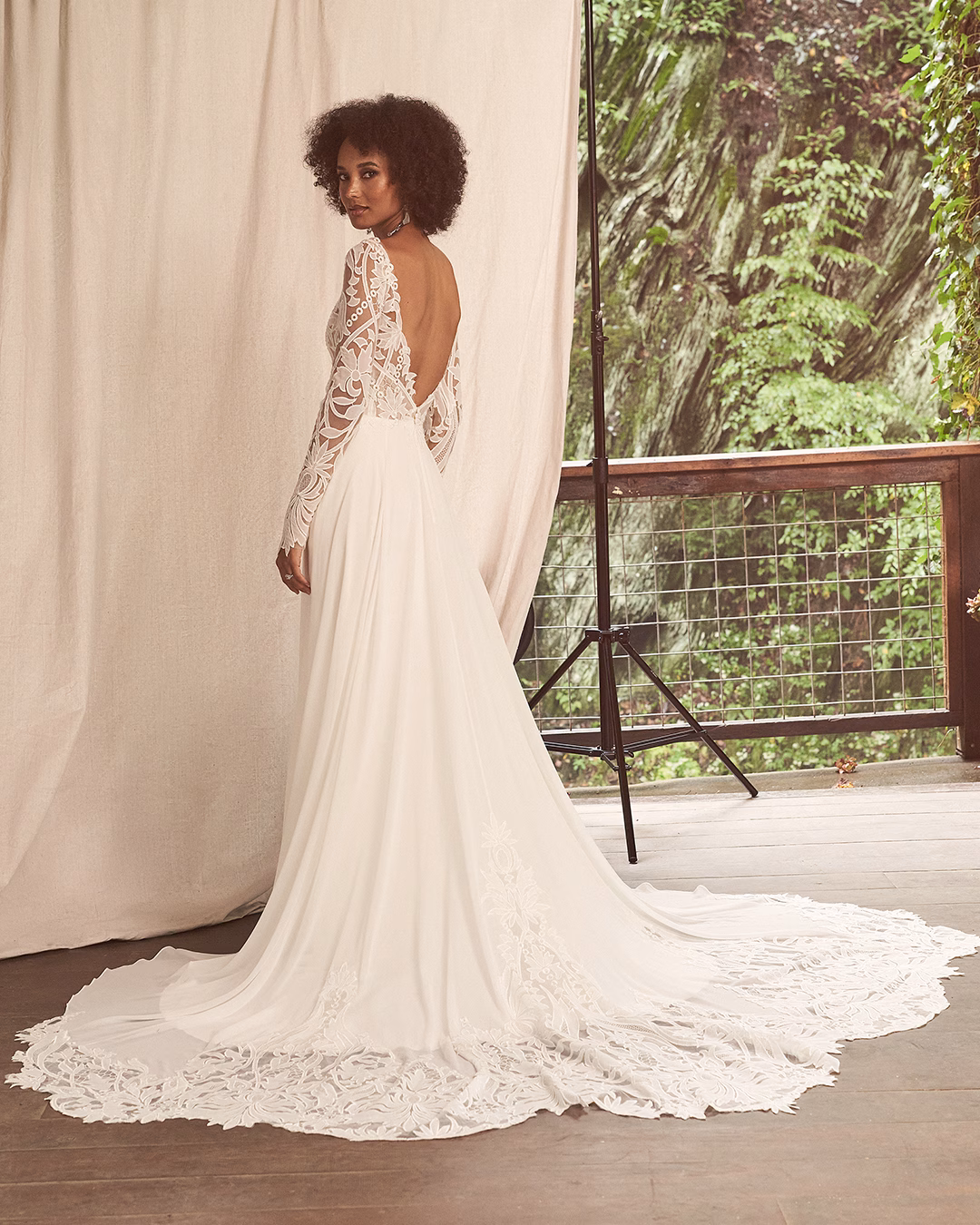 Vestido en línea A de gasa con mangas largas, escote en V profundo y espalda baja en V. El corpiño y las mangas están elaborados con encaje que incluye detalles de gasa cortada con láser, creando una cola en largo capilla con recortes en forma de concha. Se completa con botones cubiertos de gasa en la parte trasera del corpiño.