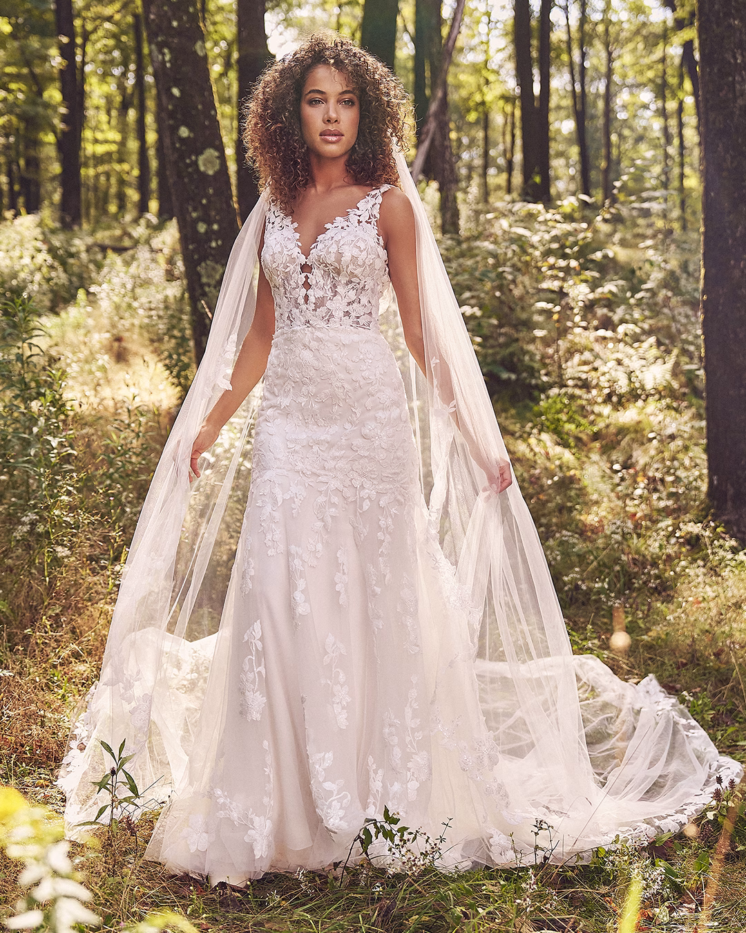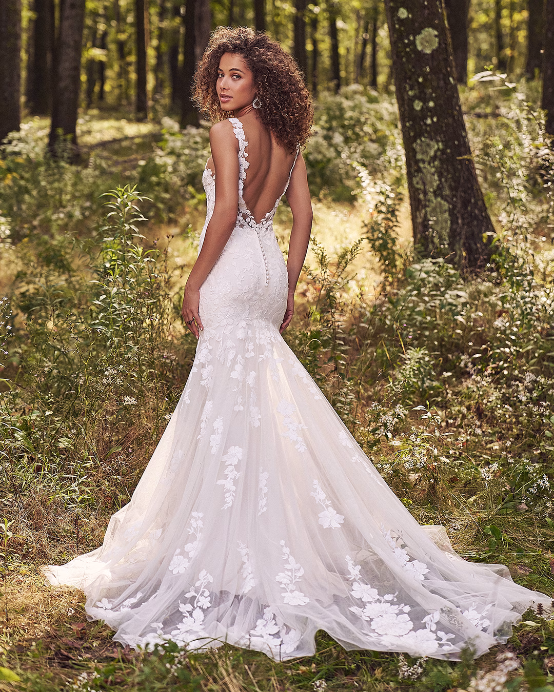 Vestido ajustado y trompeta de encaje con escote ilusión en forma de Sabrina profundo y bajo escote en V. Corsé transparente forrado en encaje Chantilly desde el escote en forma de corazón hasta la parte trasera. Adornado con aplicaciones de encaje con brillo en toda su extensión. Terminado con forro de jersey, cola de longitud capilla y botones cubiertos de tul en la parte trasera del corsé.