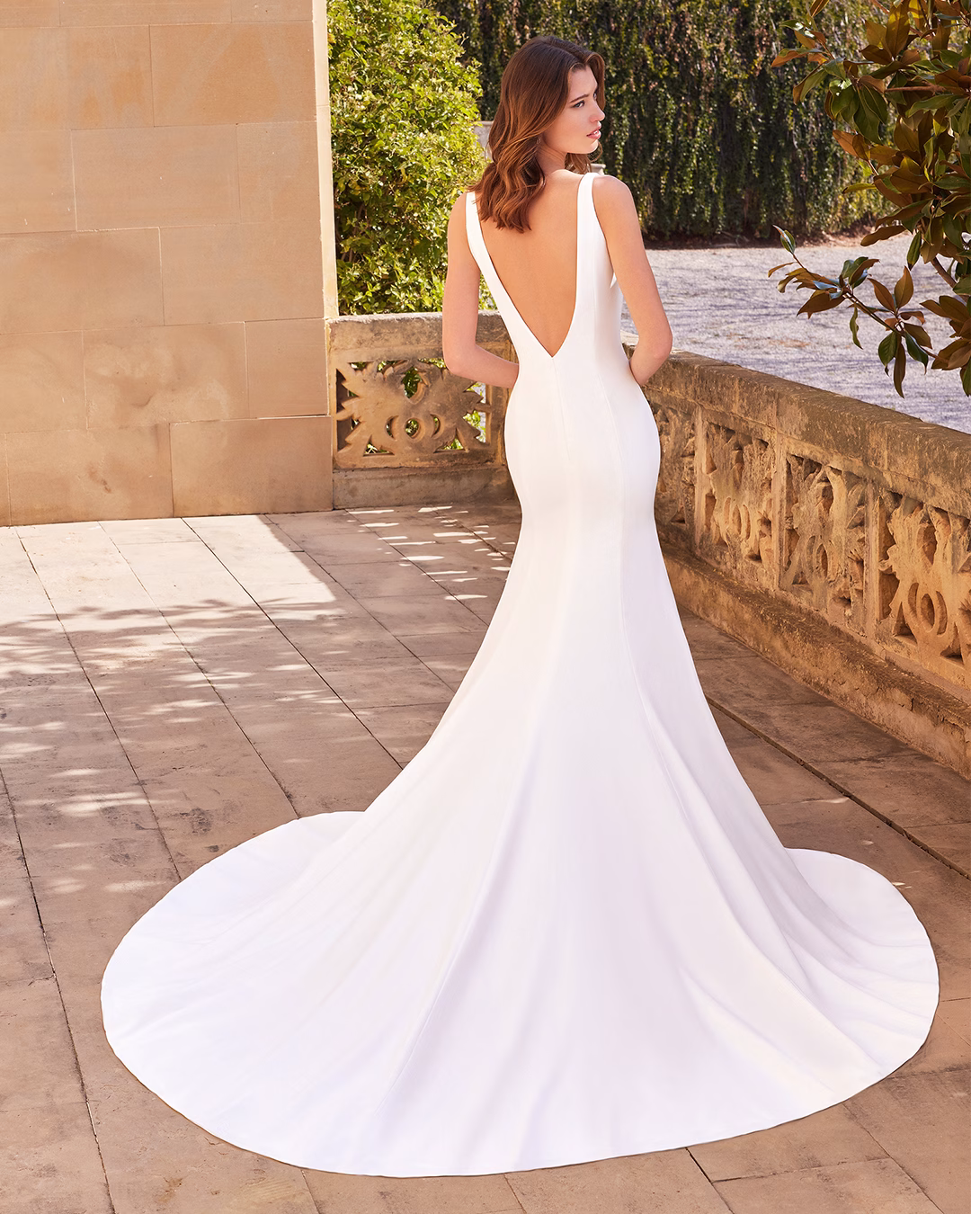 Vestido ajustado y acampanado de crepé con escote en V profundo y espalda en V. Este diseño elegante resalta la figura, ofreciendo un toque de sensualidad y sofisticación. Está completamente forrado con jersey para mayor comodidad y cuenta con una cola de largo capilla que añade un acabado dramático, ideal para una novia que desea un look moderno y elegante en su gran día.