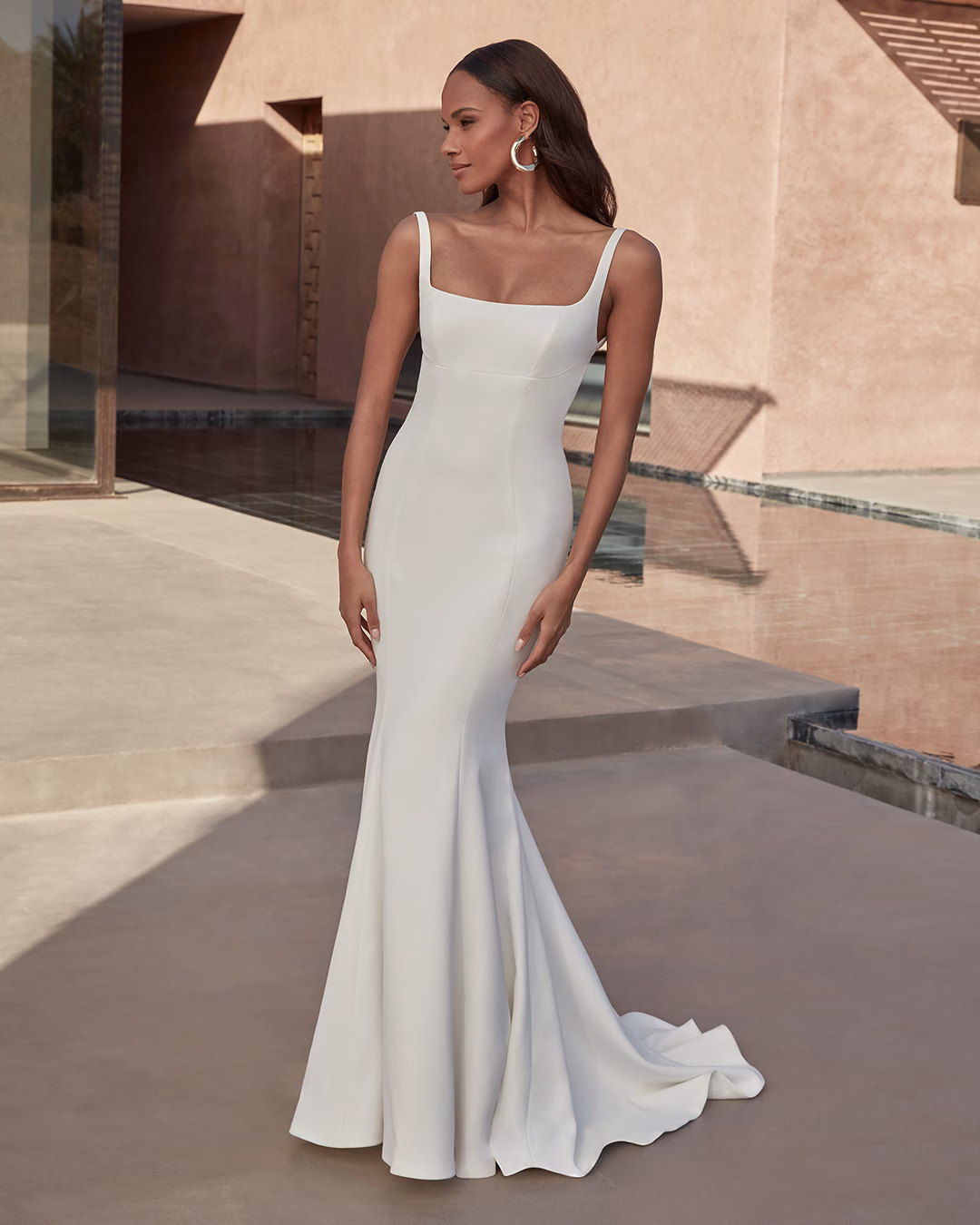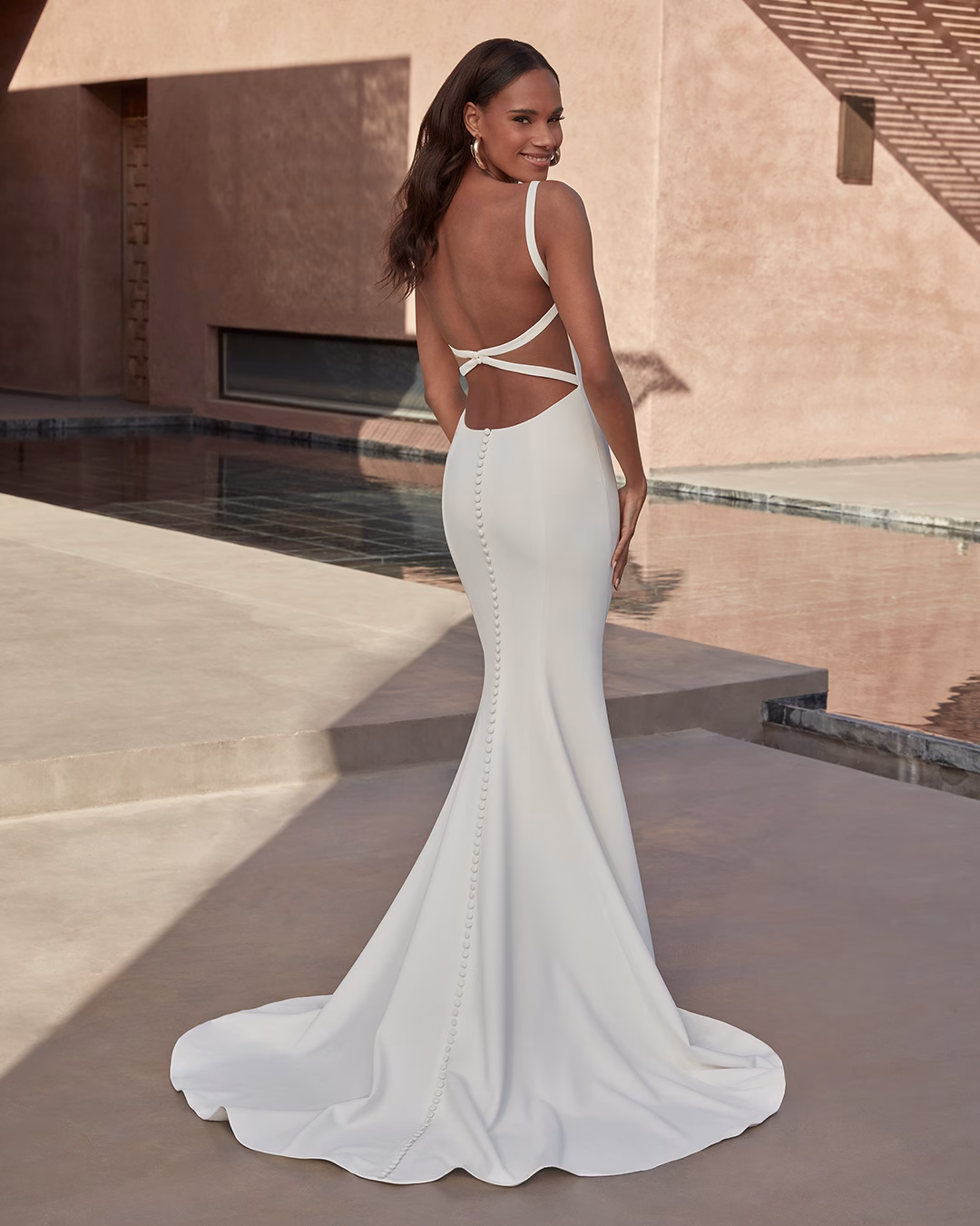 Vestido ajustado y trompeta en crepé con escote cuadrado y costura de cintura imperio. Presenta una espalda baja con abertura en forma de ojo de cerradura y tirantes de ilusión que cruzan la espalda. El diseño se completa con botones cubiertos de crepé que se extienden hasta el final de la cola en largo barrido.